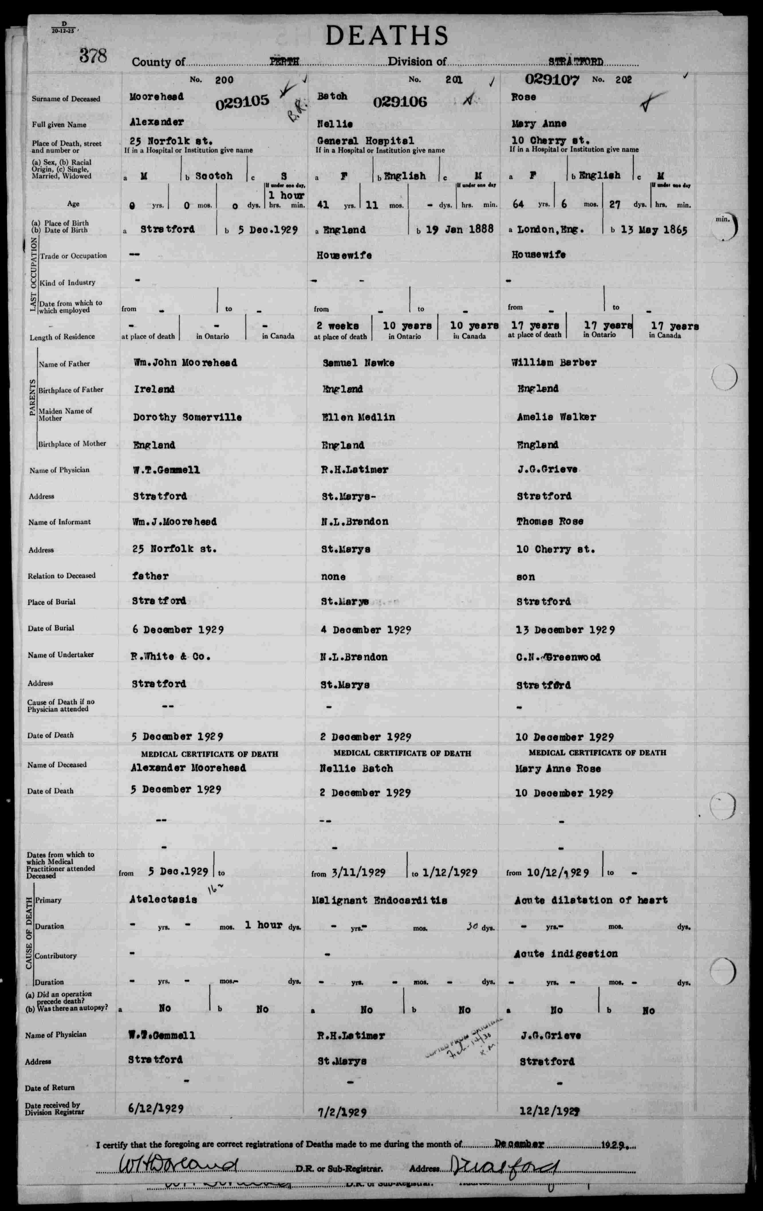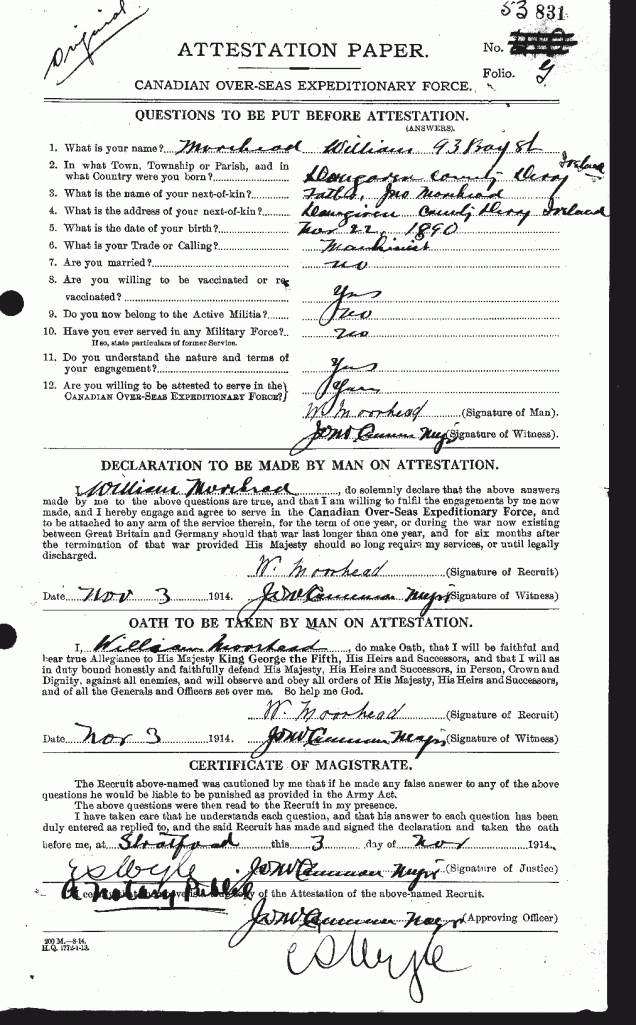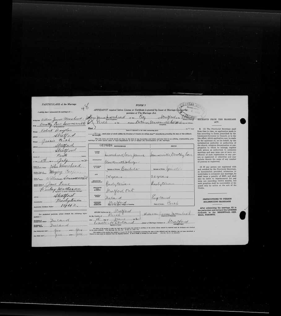 Family Search: When William James Moorehead was born on 22 November 1889, in Dungiven, Limavady, County Londonderry, Ireland, his father, Charles George Moorehead, was 32 and his mother, Alice Mary Berry, was 30. He married Dorothy Love Sommerville on 1 July 1922, in Stratford, Perth, Ontario, Canada. They were the parents of at least 6 sons. He lived in Dungiven, County Londonderry, Ireland in 1911 and Stratford, Perth, Ontario, Canada in 1921. He registered for military service in 1914. In 1922, at the age of 32, his occupation is listed as blacksmith’s keeper in Stratford, Perth, Ontario, Canada. He died in November 1976, at the age of 87, and was buried in Avondale Cemetery, Stratford, Perth, Ontario, Canada.