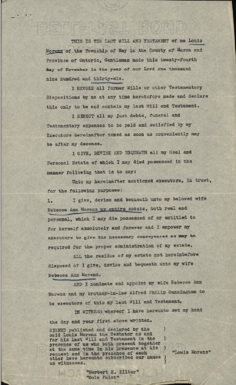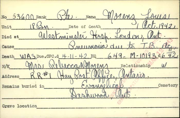Family Search: Louis Morenz was born on 29 June 1893, in Egmondville, Huron East, Huron, Ontario, Canada as the son of Albert and Elizabeth Shelby. He married Rebecca Ann Betty Cunningham on 4 October 1921, in Guelph, Wellington, Ontario, Canada. He lived in Dashwood, Bluewater, Huron, Ontario, Canada in 1921. He registered for military service in 1914. In 1914, at the age of 21, his occupation is listed as labourer. He died on 1 October 1942, in London, Ontario, Canada, at the age of 49, and was buried in Calvary United Church Cemetery, Dashwood, Bluewater, Huron, Ontario, Canada.