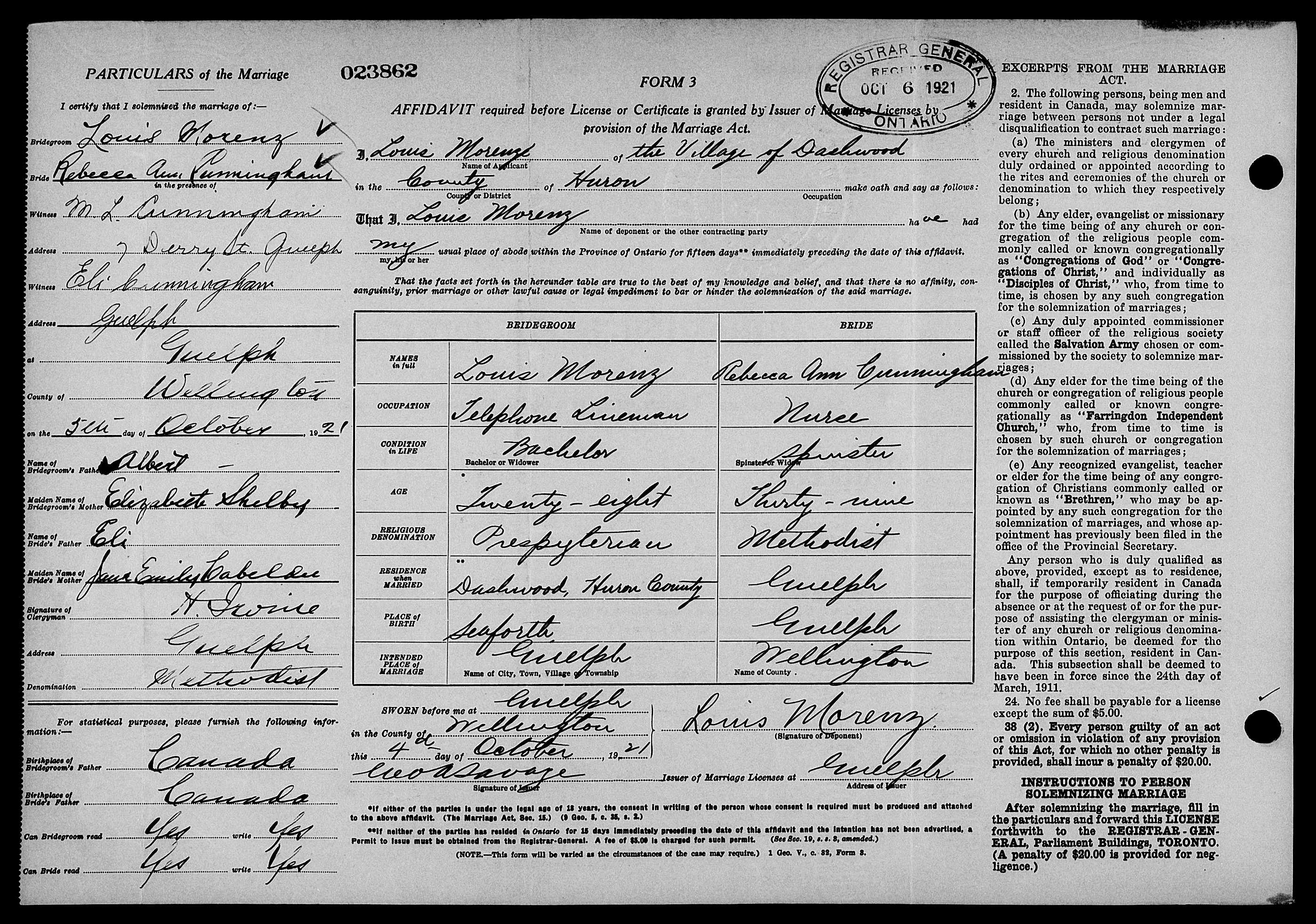 Family Search: Louis Morenz was born on 29 June 1893, in Egmondville, Huron East, Huron, Ontario, Canada as the son of Albert and Elizabeth Shelby. He married Rebecca Ann Betty Cunningham on 4 October 1921, in Guelph, Wellington, Ontario, Canada. He lived in Dashwood, Bluewater, Huron, Ontario, Canada in 1921. He registered for military service in 1914. In 1914, at the age of 21, his occupation is listed as labourer. He died on 1 October 1942, in London, Ontario, Canada, at the age of 49, and was buried in Calvary United Church Cemetery, Dashwood, Bluewater, Huron, Ontario, Canada.