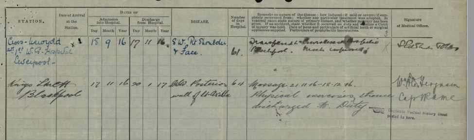 He participated in the Battle of Flers-Courcelette that started 15 September 1916 at the Somme wand was wounded in the right shoulder and face being transferred to No. 3 Stationarly Hospital on 16 September 1915. He was sent to England for treatment aboard the H.S. Mabero.