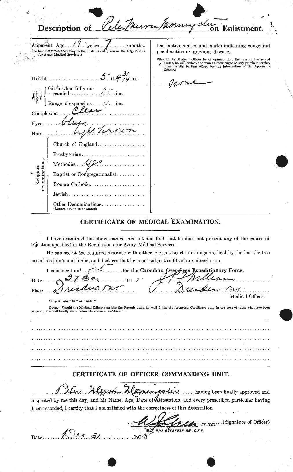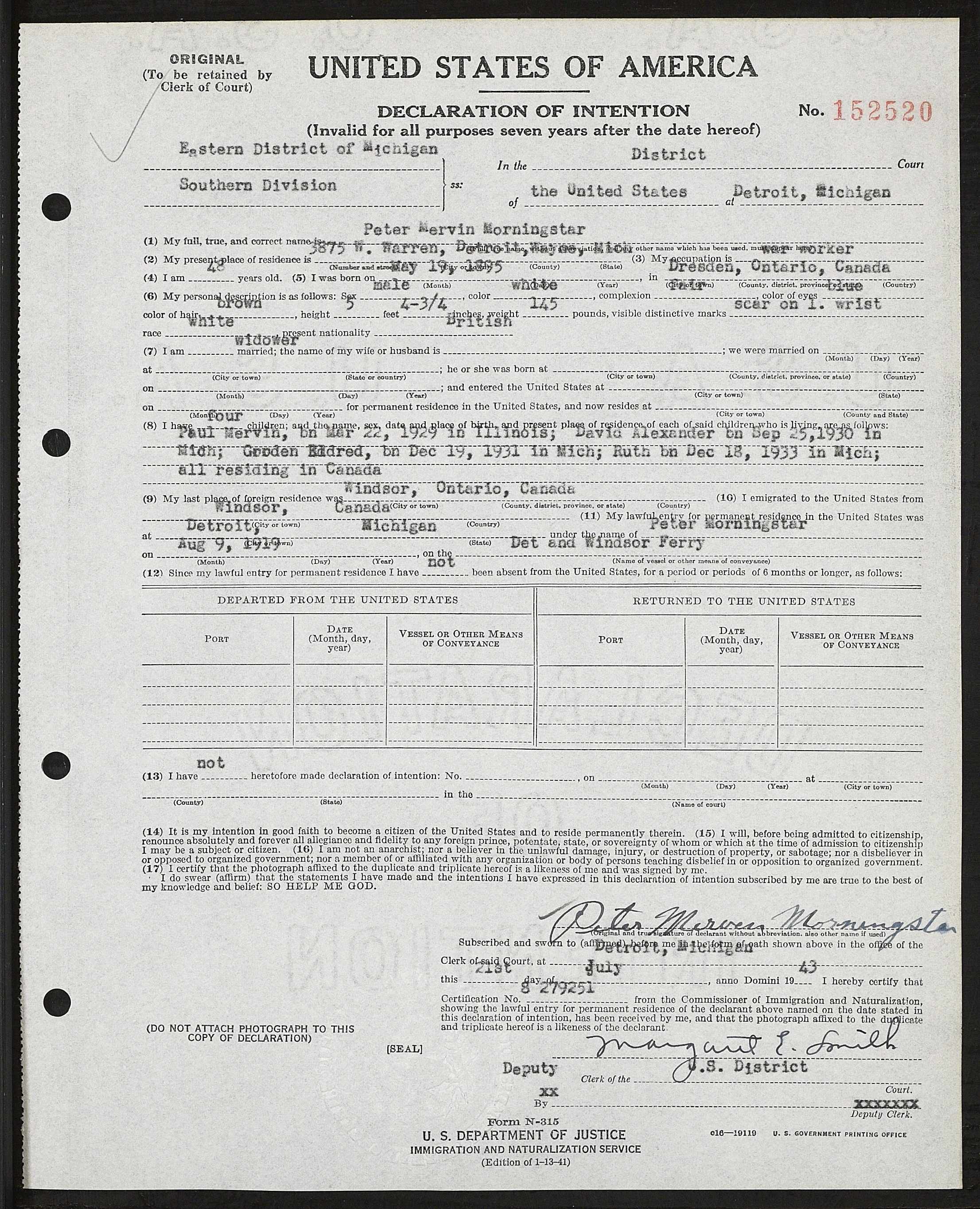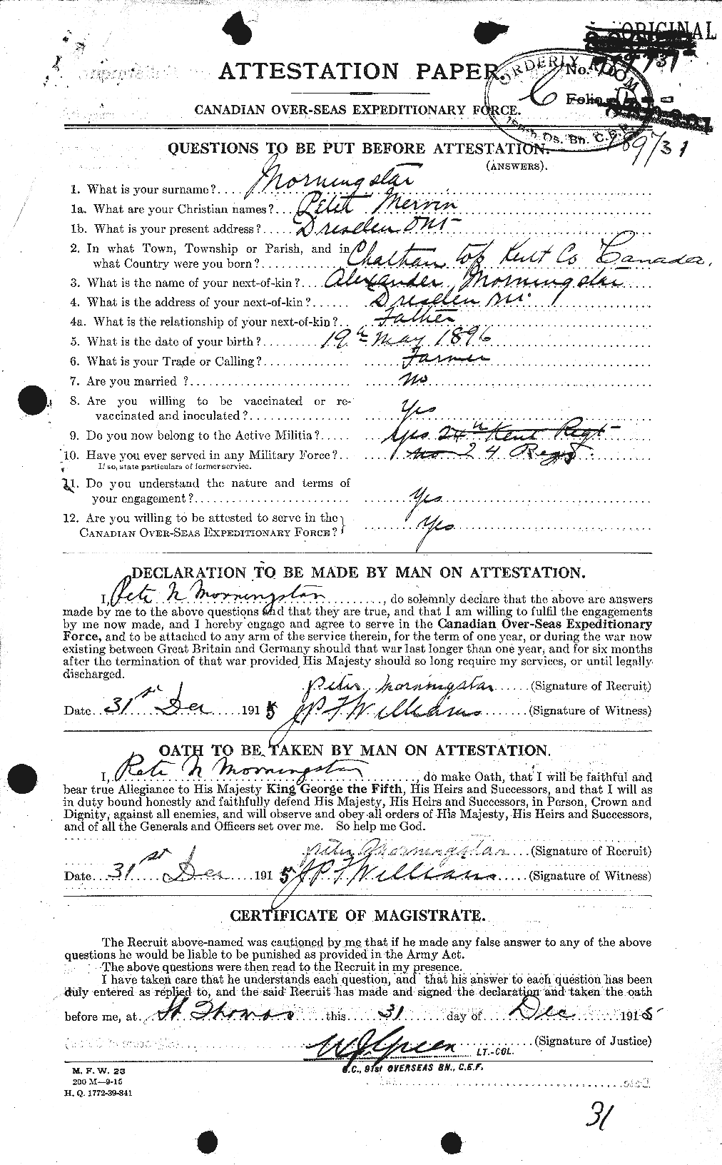 Family Search: When Private Peter Mervin Morningstar was born on 19 May 1895, in Dresden, Camden, Kent, Ontario, Canada, his father, Alexander Daniel Morningstar, was 46 and his mother, Caroline Amelia Harrett, was 42. He married Marjorie Irene Laskey in 1929, in Illinois, United States. They were the parents of at least 3 sons. He immigrated to Detroit, Wayne, Michigan, United States in 1919 and lived in Houghton, Houghton, Michigan, United States in 1935 and Detroit Ward 6, Detroit, Wayne, Michigan, United States in 1940. He registered for military service in 1915. He died on 9 April 1950, at the age of 54, and was buried in Dresden, Chatham-Kent, Ontario, Canada.