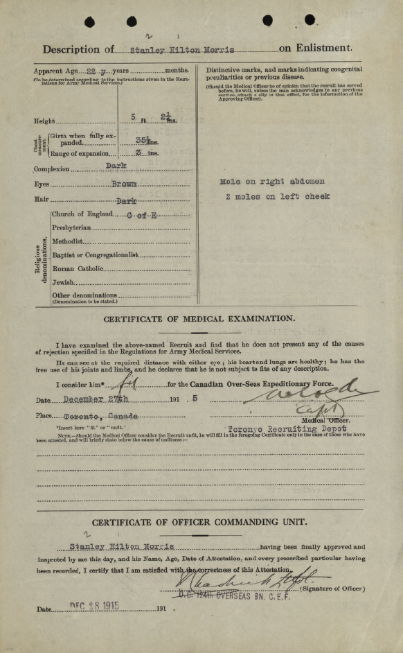 Family Search: When Private Hilton Stanley Morris was born on 26 December 1894, in Ventnor, Isle of Wight, Hampshire, England, United Kingdom, his father, William Gaiger Morris, was 31 and his mother, Rose Ellen Brown, was 34. He immigrated to Ontario, Canada in 1924 and lived in Toronto, York, Ontario, Canada in 1915 and Ventnor, Isle of Wight, Hampshire, England in 1939. He registered for military service in 1915. In 1915, at the age of 21, his occupation is listed as machinist in Toronto, York, Ontario, Canada. He died in 1964, at the age of 70.