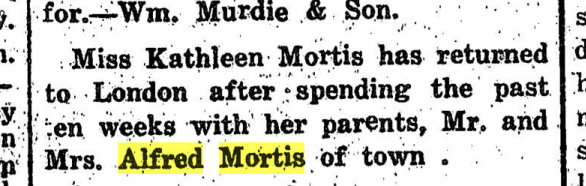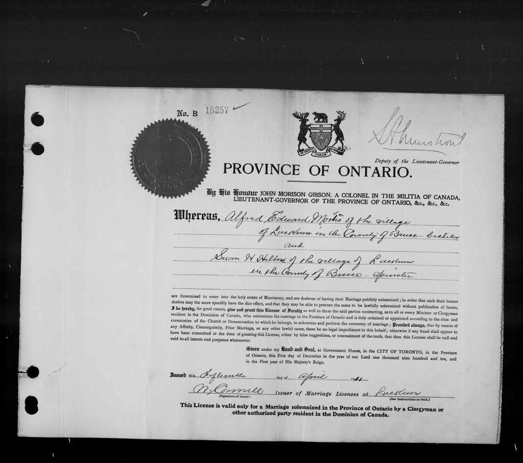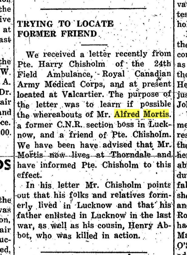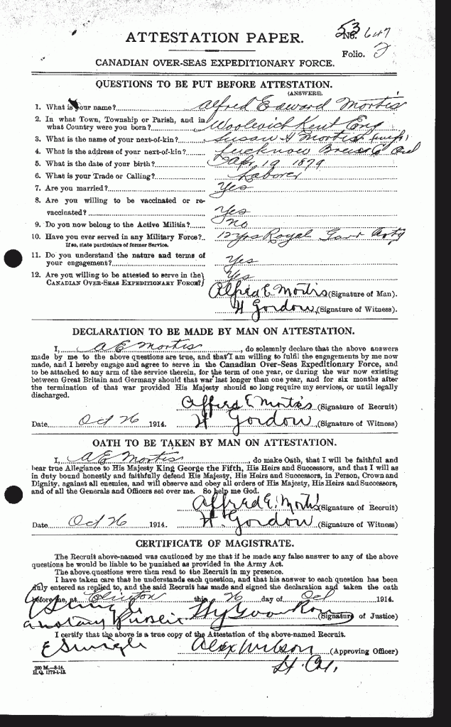 Family Search: Private Alfred Edward Mortis was born in 1879, in England, United Kingdom as the son of Alfred Edward Mortis and Mary Ann Norrington. He married Susan Harriet Hilton on 17 April 1911, in Lucknow, Bruce, Ontario, Canada. They were the parents of at least 4 daughters. He lived in Drayton, Wellington, Ontario, Canada in 1924 and Kinloss, Kinloss Township, Bruce, Ontario, Canada in 1931. He registered for military service in 1886. In 1931, at the age of 52, his occupation is listed as railway section boss in Kinloss, Kinloss Township, Bruce, Ontario, Canada. He died in 1963, at the age of 84, and was buried in Forest Lawn Memorial Gardens, London, Ontario,
