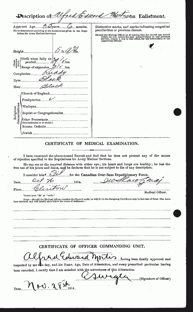 [i] Private Mortis was one of he “originals” of the 18th Battalion, enlisting on October 26, 1914 in Clinton, Ontario. He was 35-years old, above average age for a soldier in the C.E.F. in that era.