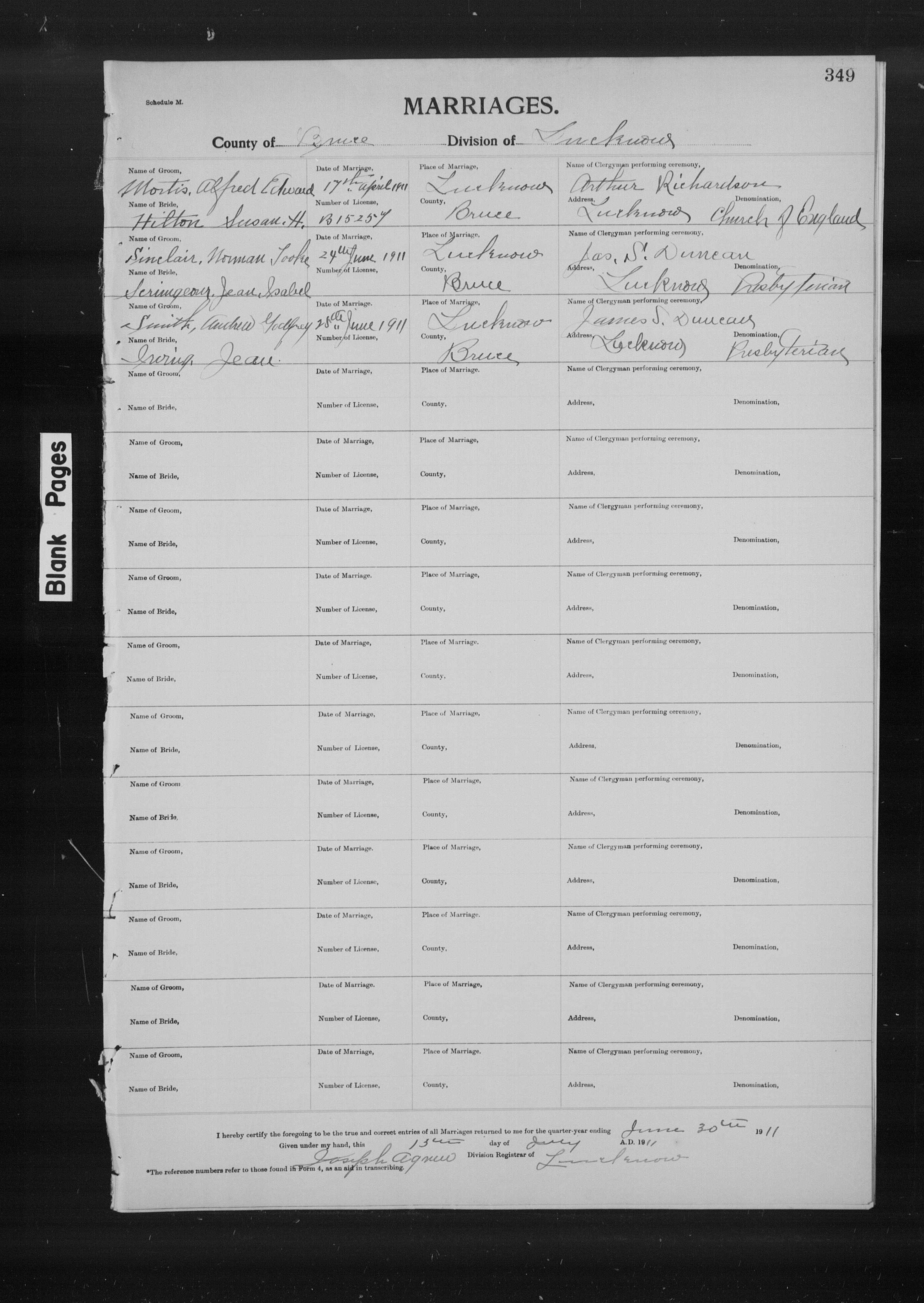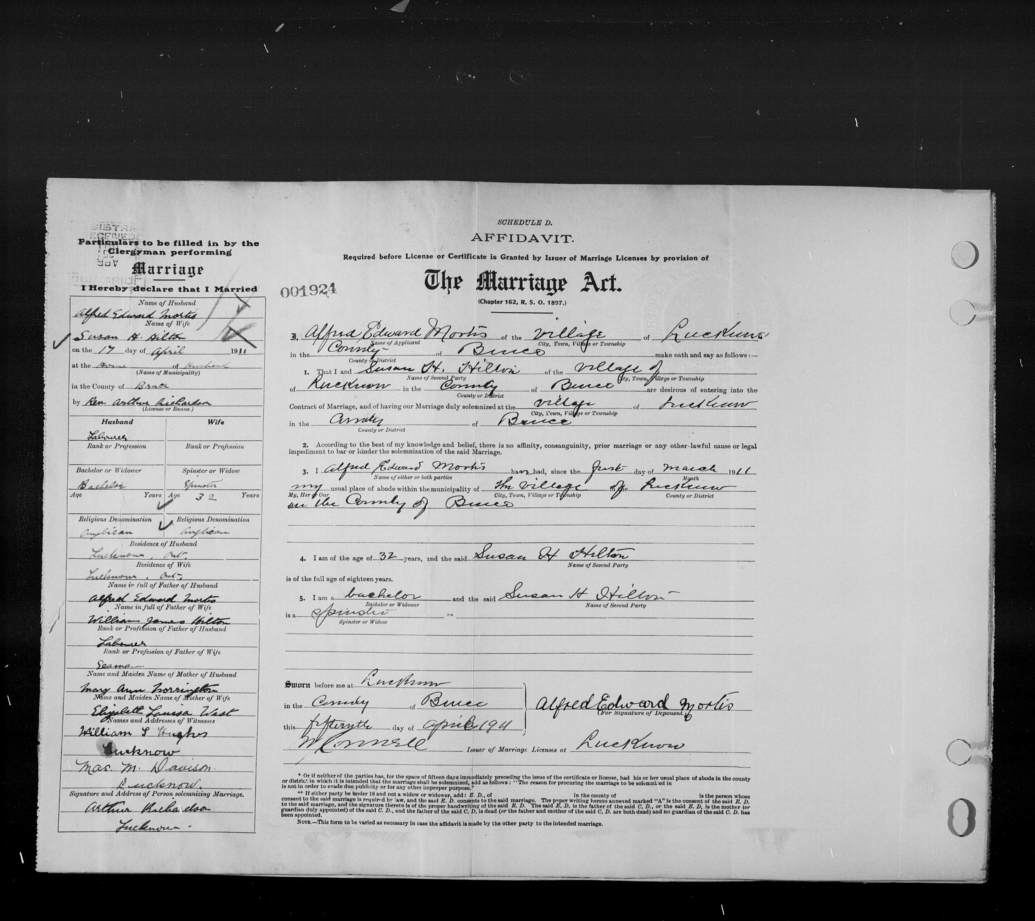 Family Search: Private Alfred Edward Mortis was born in 1879, in England, United Kingdom as the son of Alfred Edward Mortis and Mary Ann Norrington. He married Susan Harriet Hilton on 17 April 1911, in Lucknow, Bruce, Ontario, Canada. They were the parents of at least 4 daughters. He lived in Drayton, Wellington, Ontario, Canada in 1924 and Kinloss, Kinloss Township, Bruce, Ontario, Canada in 1931. He registered for military service in 1886. In 1931, at the age of 52, his occupation is listed as railway section boss in Kinloss, Kinloss Township, Bruce, Ontario, Canada. He died in 1963, at the age of 84, and was buried in Forest Lawn Memorial Gardens, London, Ontario,