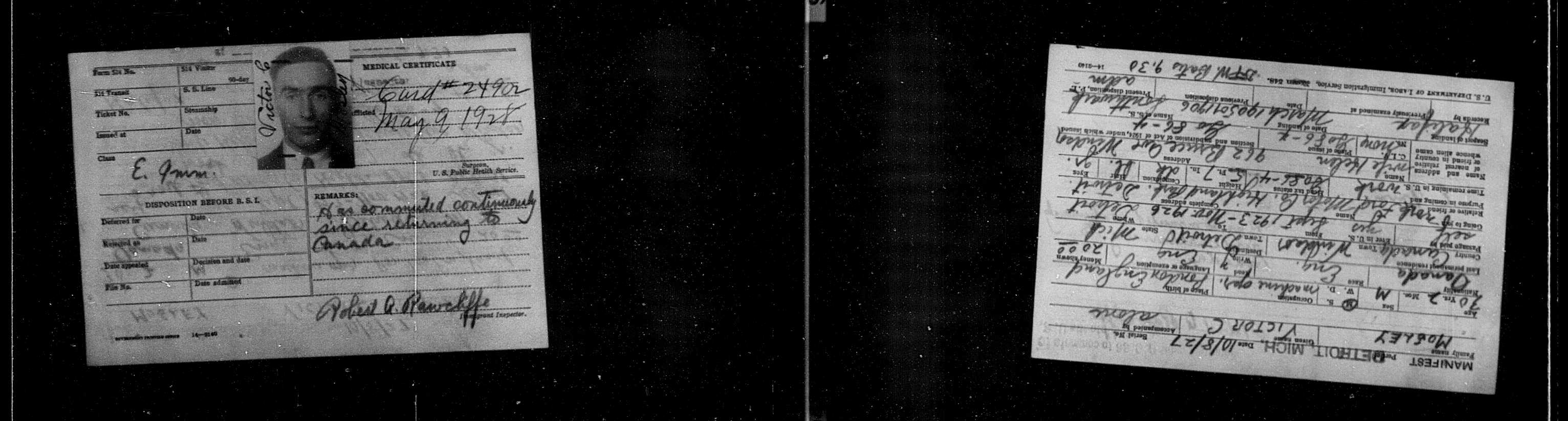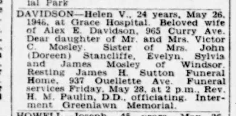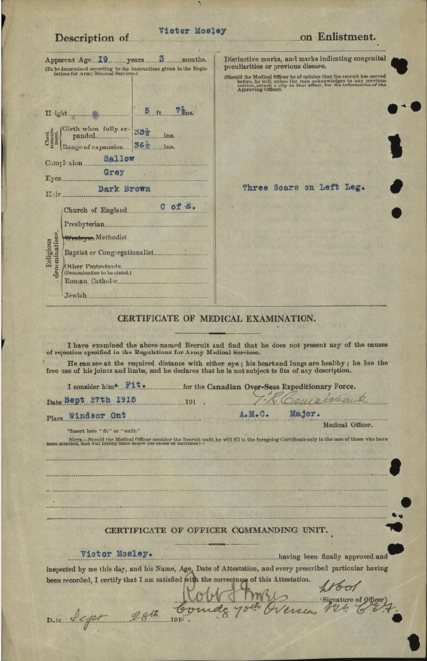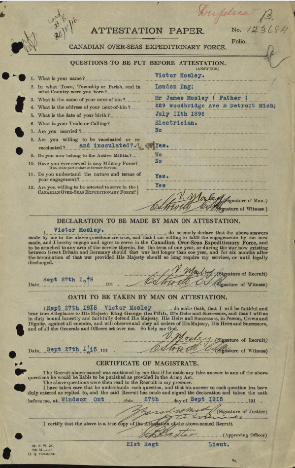 Family Search: When Private Victor Cyril Mosley was born on 11 July 1897, in Southwark, London, England, United Kingdom, his father, James Mosley, was 35 and his mother, Rosina Cooke, was 31. He married Ellen May Hatton on 17 December 1922, in Windsor, Essex, Ontario, Canada. They were the parents of at least 1 son and 4 daughters. He immigrated to Detroit, Wayne, Michigan, United States in 1965 and lived in Essex, Essex, Ontario, Canada in 1911 and Windsor, Sandwich, Essex, Ontario, Canada in 1931. He died on 12 December 1982, in Sun City, Riverside, California, United States, at the age of 85, and was buried in Greenlawn Memorial Gardens, Oldcastle, Essex, Ontario, Canada.