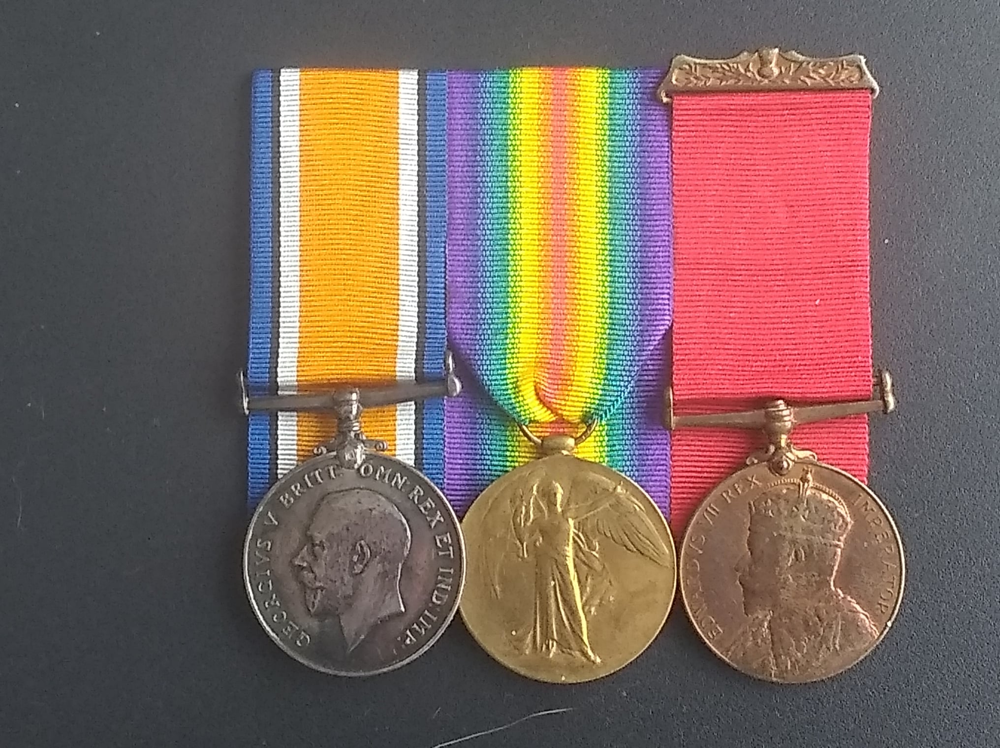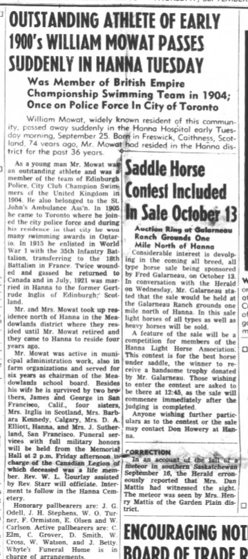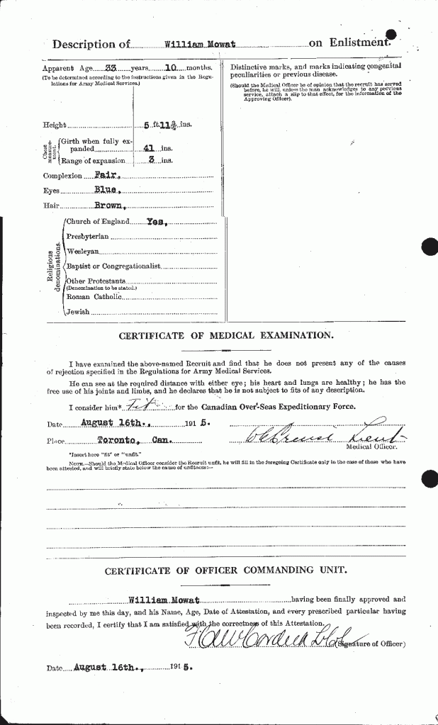 “Here we have the British War Medal and Victory Medal (405365 A.SJT. W. MOWAT. 18-CAN. INF.) together with The King Edward VII Police (Scotland) Medal 1903 (P.C. W. MOWATT), also known as the Visit to Scotland Medal 1903. The thistle suspender is also present with the later medal, but is often lost on other examples. Briefly, William Mowat was born in Freswick, Canesbay, Scotland in 1881, immigrated to Canada in 1907 and enlisted in the 35th Battalion in Toronto on August 16, 1915. His profession is listed as Electrician and also interestingly, Professor of Lifesaving (whatever that is). There is no mention of police service, however I note in his service records that he was promoted to Acting Serjeant (Provost Serjeant) in 1916, so there may be something to it. He later reverted to his former rank, possibly in order to get into action in France. He eventually ended up with the 18th Battalion in 1917 and suffered a GSW to the back on August 28, 1918 (Shrapnel, contusion and gassed). By the time he recovered, the war was essentially over and he was repatriated to Canada. In 1919 he ended up in near Hanna, Alberta as a farmer and purchases a quarter section of land with the aid of the Soldiers Settlement Board in 1920. He married in 1921, and had one child in 1925, who sadly died the same year. There are no more children. In 1925, he applied for another quarter section of land through the provisions of the Soldiers Grant legislation. He acquired a Certificate for Soldier Grant Entry and made improvements over the next several years as required. In 1932, having fulfilled all the requirements, he is granted patent to the land. William Mowat passed away September 25, 1956 and is buried in the Hanna Cemetery.”