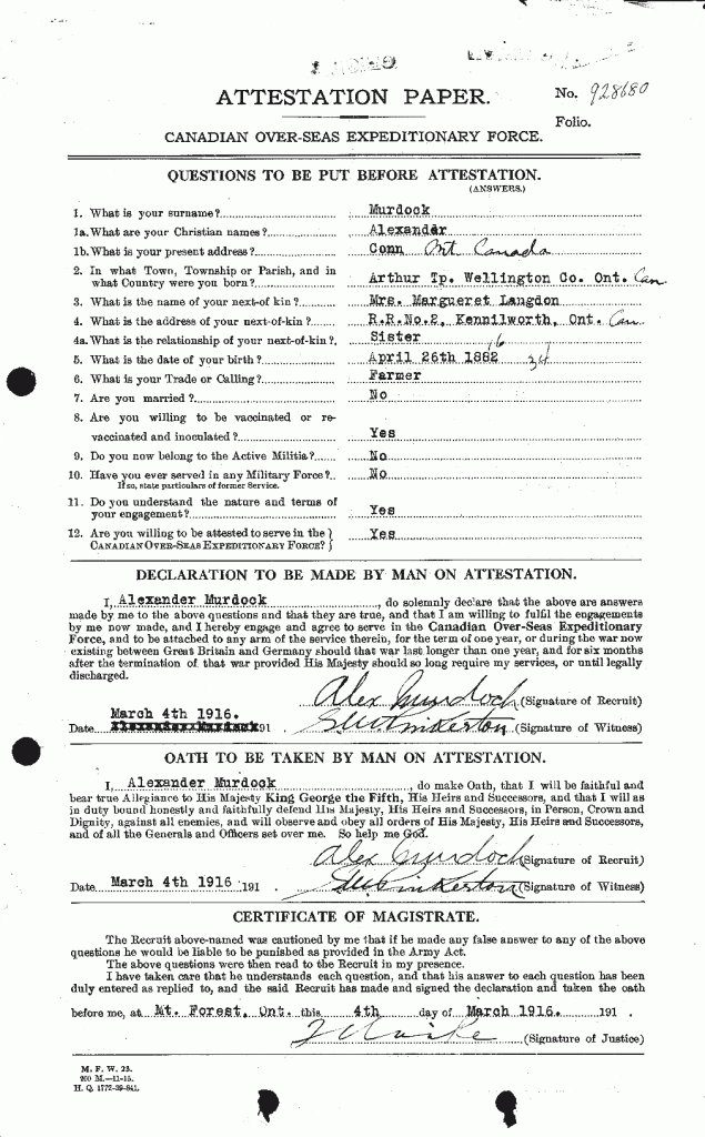 Family Search: When Alexander Murdock was born on 26 April 1882, in Arthur, Wellington, Ontario, Canada, his father, George Murdock, was 61 and his mother, Margaret Donald, was 46. He lived in Conn, Wellington, Ontario, Canada in 1916 and Mount Forest, Wellington North, Wellington, Ontario, Canada in 1921. He registered for military service in 1916. In 1916, at the age of 34, his occupation is listed as farmer in Conn, Wellington, Ontario, Canada. He died in 1939, at the age of 57, and was buried in Greenfield