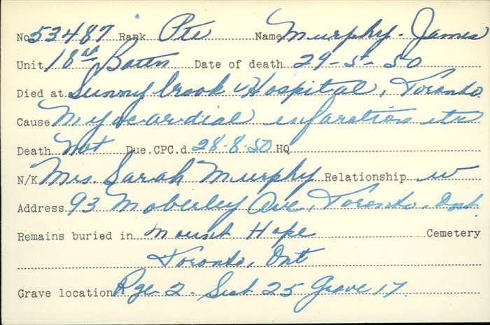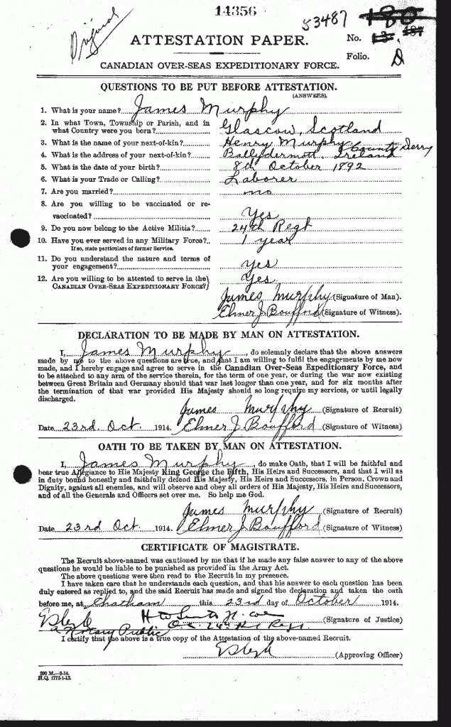Murphy, James: Service no. 53487 Digitized Service Record Source: 18th Battalion Nominal Roll, April 1915. Find-A-Grave Share this: Click to email a link to a friend (Opens in new window) Email Click to share on Facebook (Opens in new window) Facebook Click to share on X (Opens in new window) X Click to share on Reddit (Opens in new window) Reddit Click to share on LinkedIn (Opens in new window) LinkedIn Click to print (Opens in new window) Print Click to share on Tumblr (Opens in new window) Tumblr Click to share on Pocket (Opens in new window) Pocket Click to share on Pinterest (Opens in new window) Pinterest Click to share on Telegram (Opens in new window) Telegram Click to share on WhatsApp (Opens in new window) WhatsApp Like Loading...