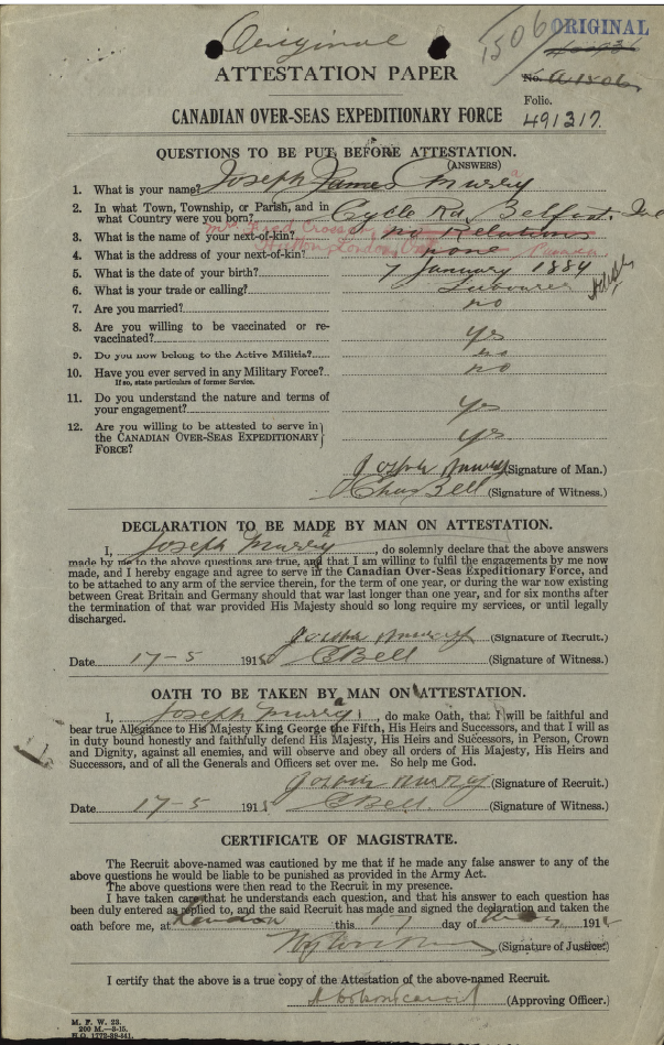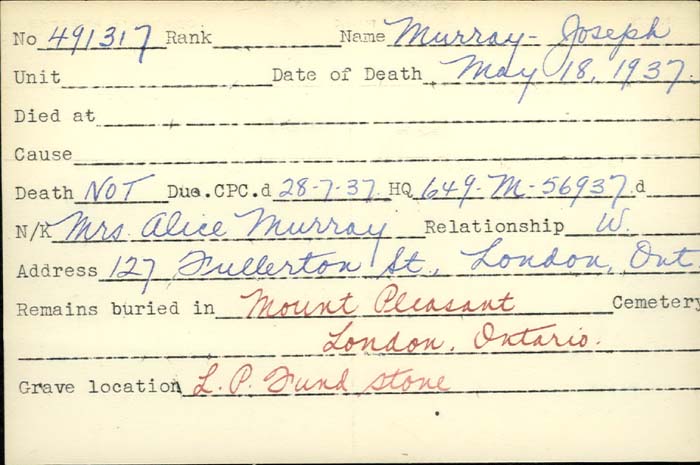 Family Search: Private Joseph Murray was born on 7 January 1889, in Belfast, Ireland as the son of William Murray and Elizabeth Crosley. He married Alice Liscombe on 30 July 1927, in London, Ontario, Canada. He immigrated to Canada in 1913. He registered for military service in 1915. In 1915, at the age of 26, his occupation is listed as labourer. He died on 18 May 1937, in London, Ontario, Canada, at the age of 48, and was buried in Mount Pleasant Cemetery, West McGillivray, Middlesex, Ontario, Canada.