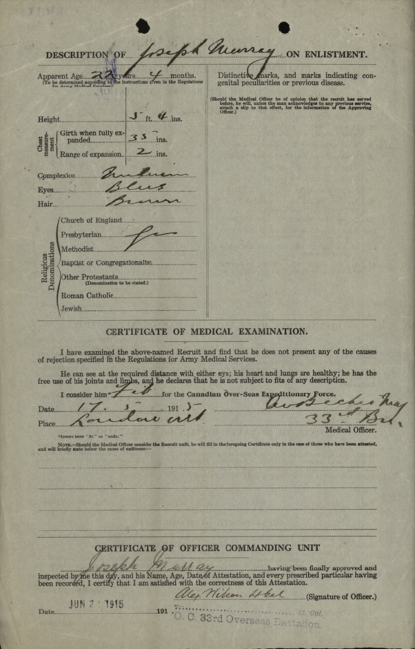 This man enlisted with the 33rd Battalion on 5 May 1915 at London, Ontario.