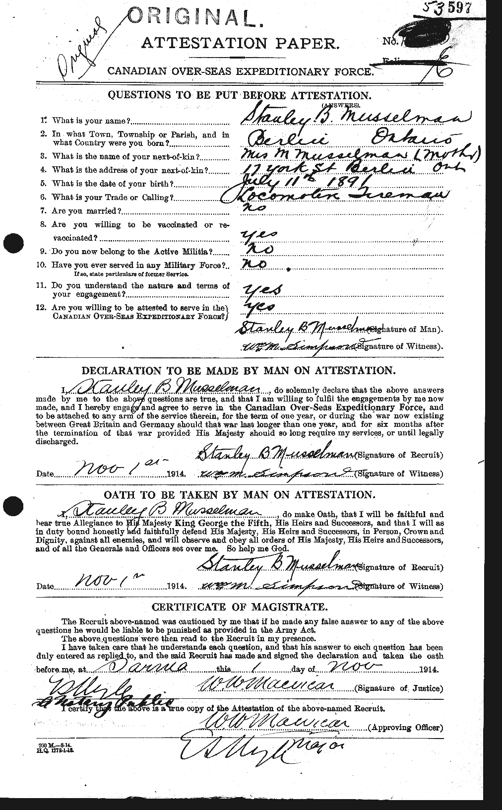 We have a big English instructor for an hour every day and believe me when he gets through with us we are all sweating. The we have bayonet drill every day. We have spring bayonets, pads, masks and gloves and go for each other like a German and a Britisher, lots of fun and you can’t get hurt. I had two goes today with Stan Musselman, my chum. We have lots of hard work but the officers are a good sort and gives us lots of fun.