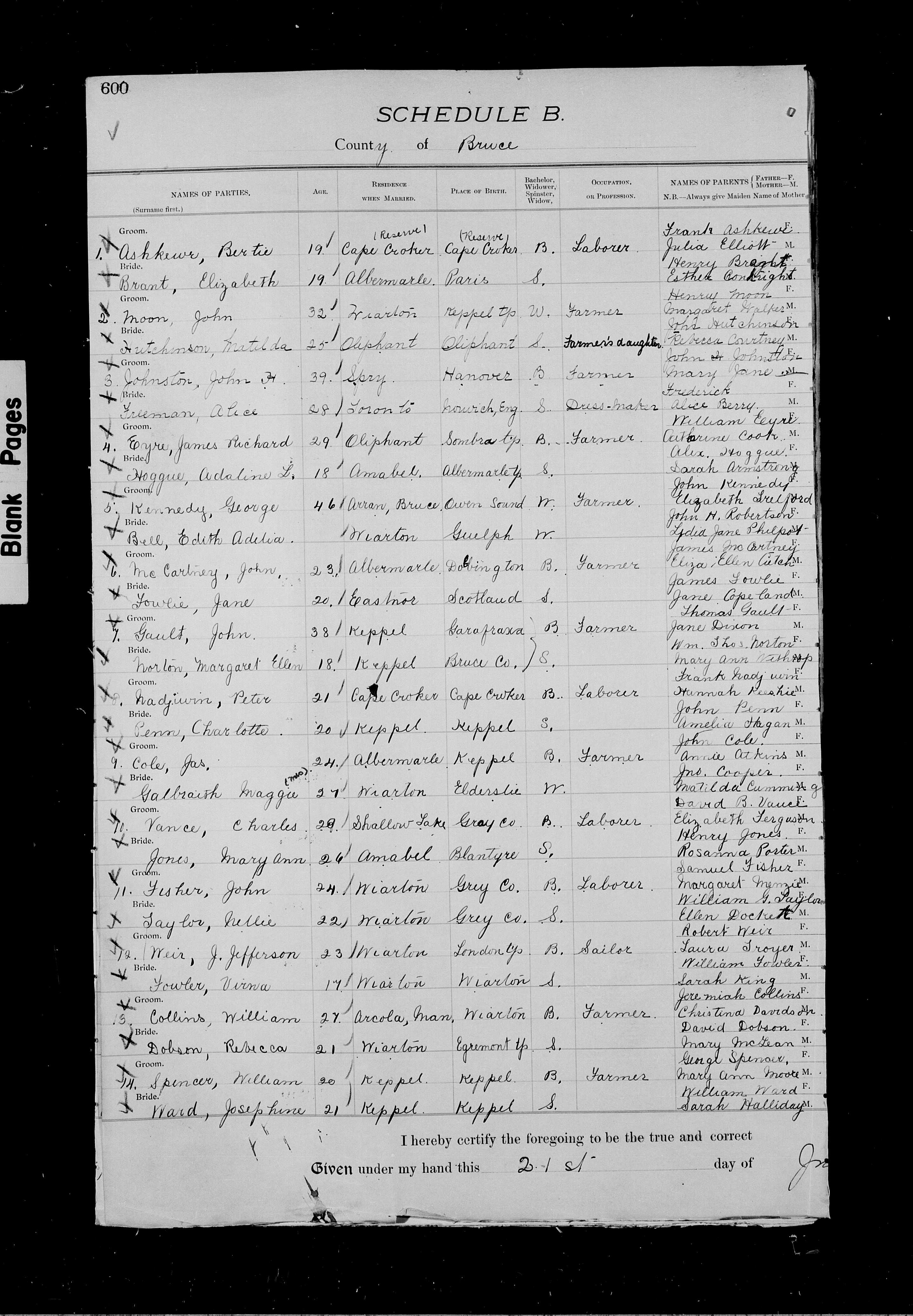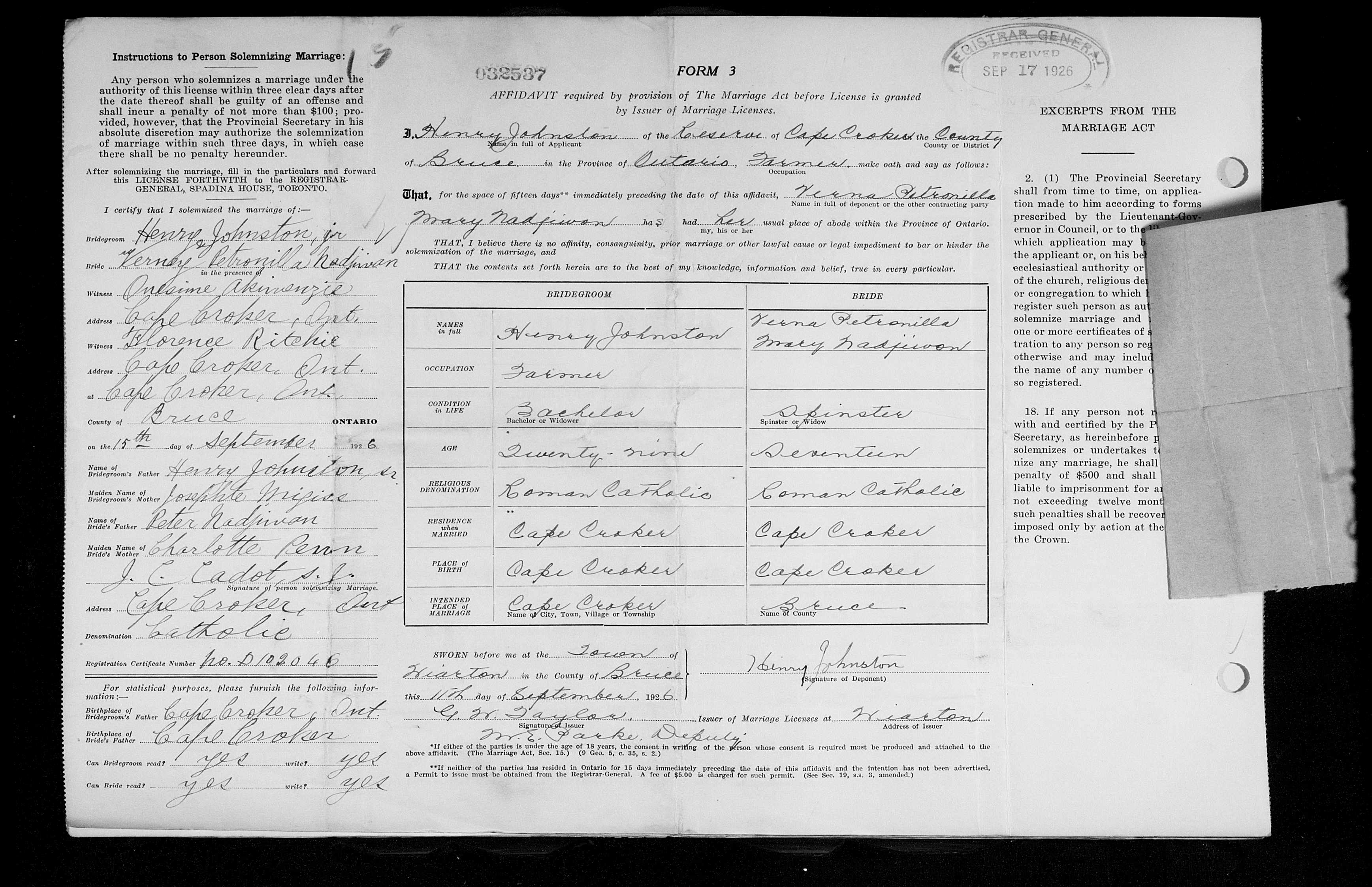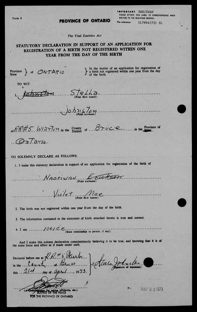 “50 Years Ago — July 14, 1949, Echoes From The Past, The Wiarton Echo, 14 July 1999, page 5. — Peter Nadjiwan has been elected Chief of the Cape Croker Reserve. The 66 year-old man defeated Chief Thos. Jones by one vote, winning 49 to 48. DEATH date from St. Mary’s church records, Michelle Archer, April 1999. OBITUARY: Peter C. Nadjiwan former Cape Croker Chief Dies London (1959) CAPE CROKER — Peter C. Nadjiwan, life-long resident of Cape Croker Reserve, died in Westminister Hospital, in London on Thursday March 19th in his 77 year. Mr. Nadjiwan served a number of terms as councillor and chief of the Reserve. He was a World War I veteran having been in 160th Bruce Battalion. He also served in the Home Guard in World War II. He was a member of St. Mary’s R.C. church choir. He is survived by his wife the former Lillian Keeshig and eight sons and four daughters. Charles, Sam and Leonard of Sudbury, Wilmer of Port Erie, Barney of Sault Ste. Marie, Rae of Camp Petawawa; Vincent of Wiarton and John at the Cape. Hannah, Mrs. N. Porte of Toronto, Violet, Mrs. L. Erickson of Sudbury, Verna Mrs. Henery Johnston, Niagara Falls and Doris, Mrs. Pat McLeod at the Cape.”