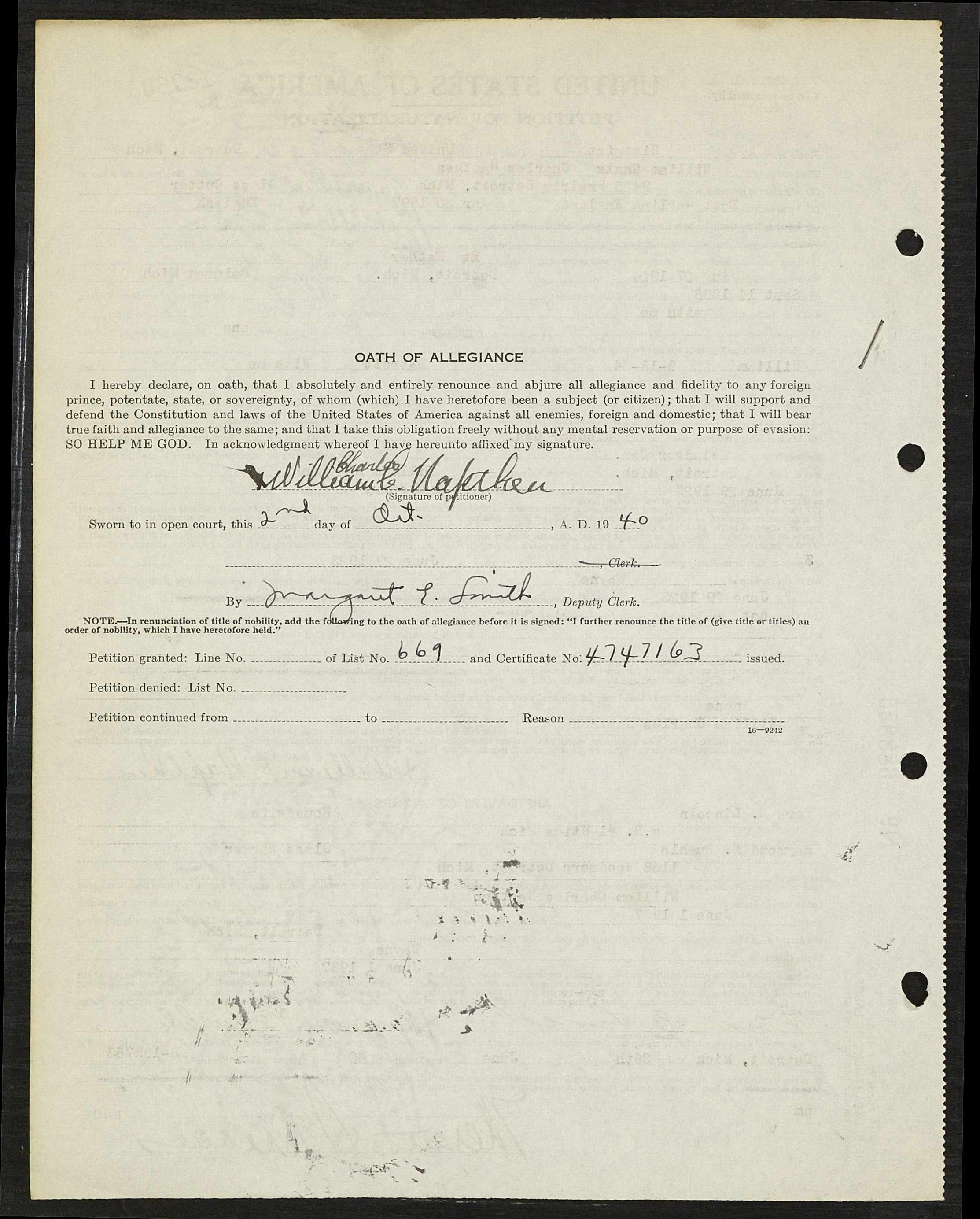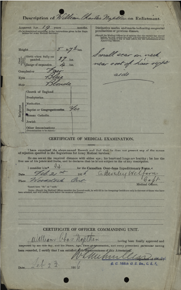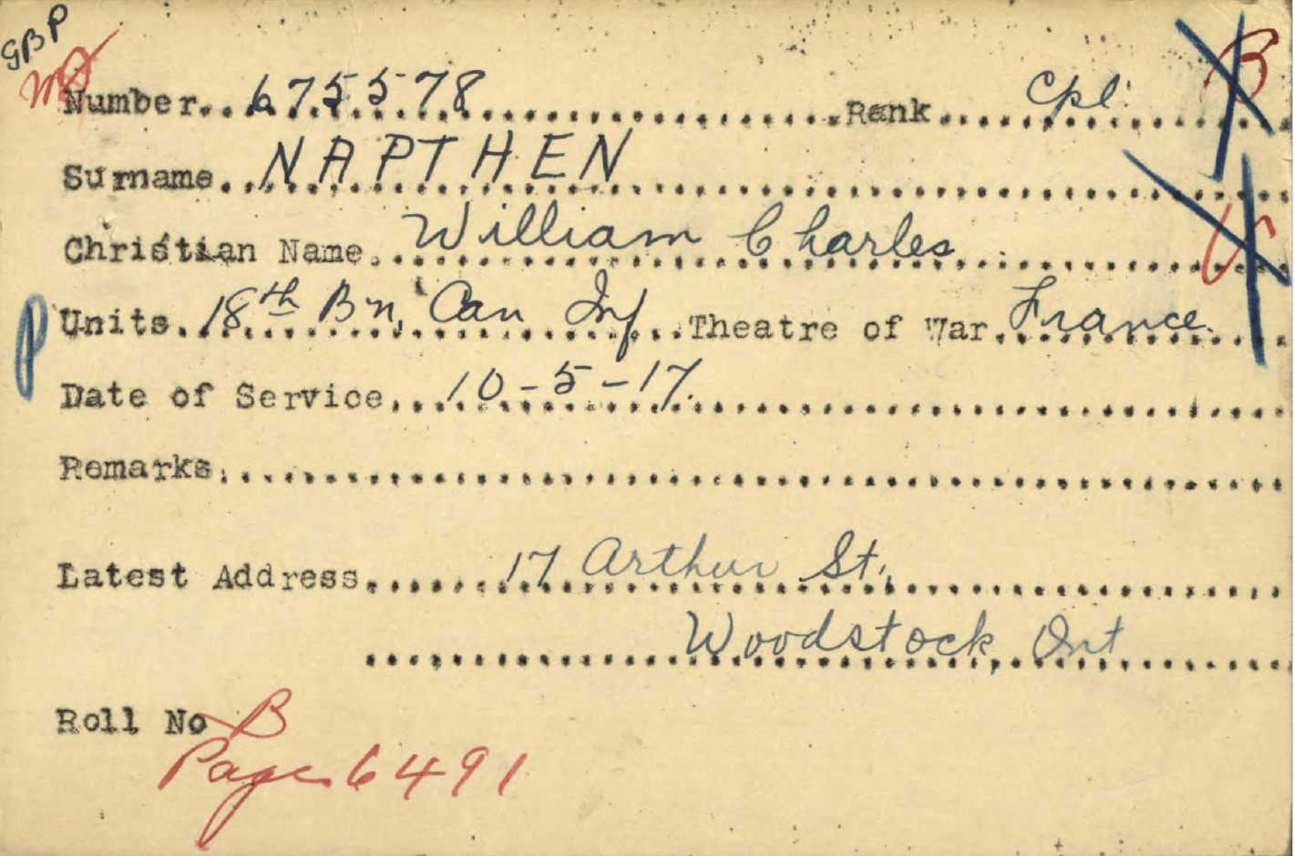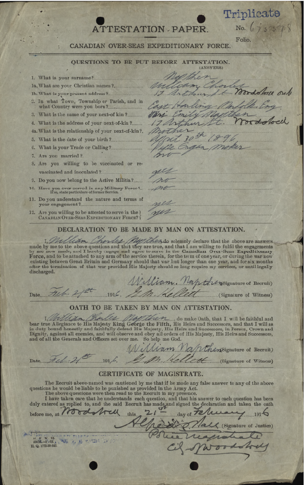 Family Search: When Corporal William Charles Napthen was born on 30 April 1897, in East Harling, Norfolk, England, United Kingdom, his father, Robert Napthan, was 34 and his mother, Emily Fuller, was 30. He married Esther Earline Heaton on 27 August 1924, in Detroit, Wayne, Michigan, United States. They were the parents of at least 1 son. He immigrated to Detroit, Wayne, Michigan, United States in 1923 and lived in North Oxford Township, Oxford, Ontario, Canada in 1911. He died on 10 June 1975, in Detroit, Wayne, Michigan, United States, at the age of 78, and was buried in Benzonia Township Cemetery, Benzonia, Benzonia Township, Benzie, Michigan, United States.