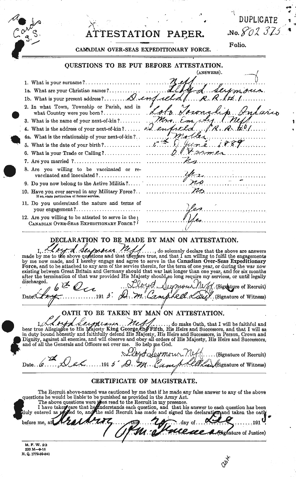 Family Search: When Sergeant Lloyd Semour Neff was born on 8 June 1889, in Lobo Township, Middlesex, Ontario, Canada, his father, Ambrose Eli Neff, was 21 and his mother, Emily Mae Moore, was 15. He lived in Middlesex, Ontario, Canada for about 10 years and Williams Township, Middlesex, Ontario, Canada in 1931. He died on 1 February 1981, at the age of 91, and was buried in Nairn Cemetery, Nairn, Middlesex, Ontario, Canada.