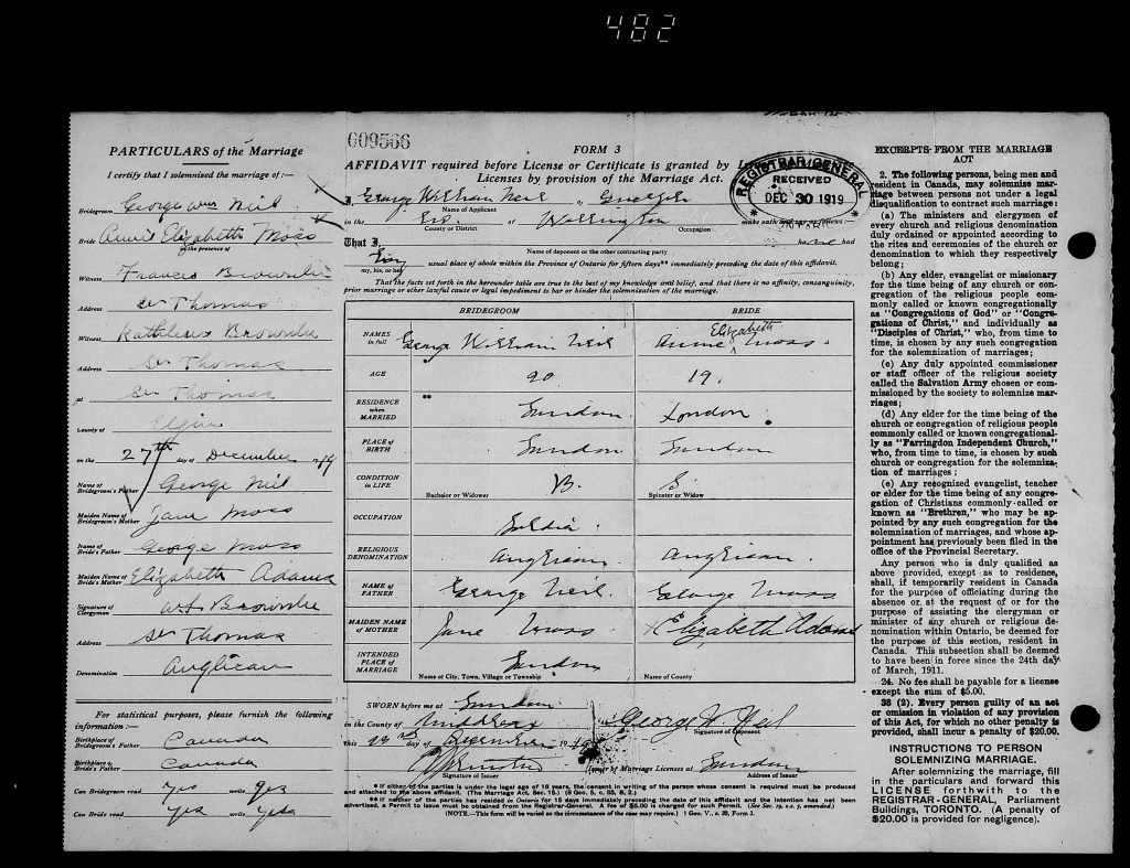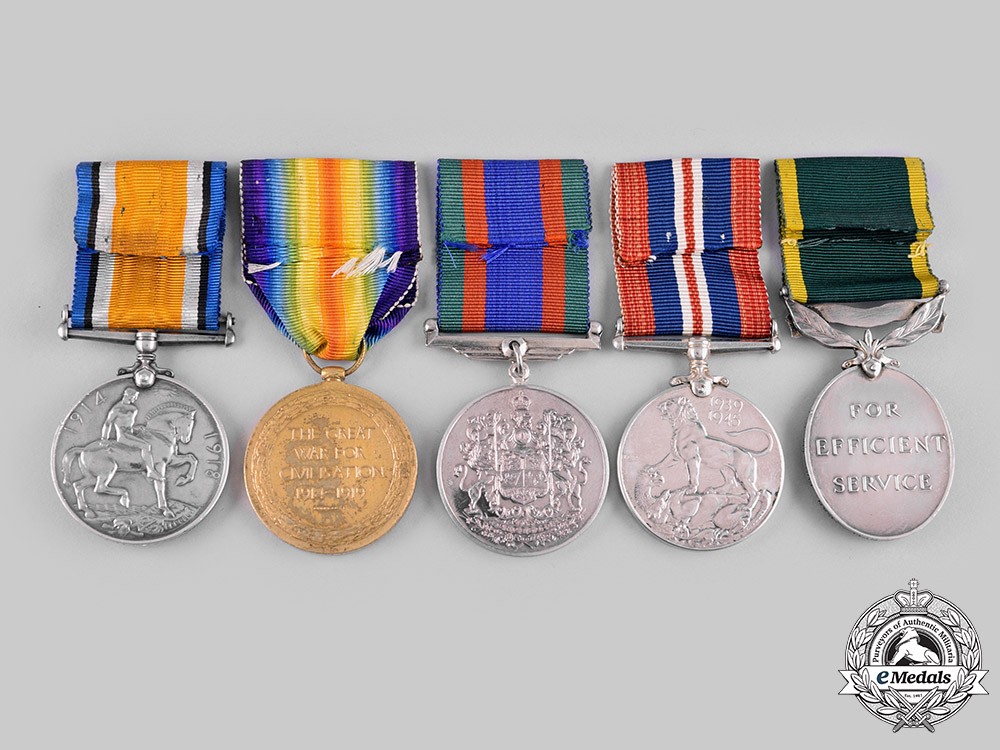 He embarked from Liverpool aboard the S.S. Cretic on March 18, 1919, arriving in Halifax, Nova Scotia on the 22nd. Private George William Neil, 18th Infantry Battalion was discharged upon demobilization at No. 1 District Depot in London, Ontario, on March 27, 1919, entitled to wear the War Service Badge, Class “A”, number 84485. For his First World War service, he was awarded the British War Medal and the Victory Medal. George William Neil married Annie Elizabeth Moss in St. Thomas, Ontario on December 28, 1919. He was a resident of London, Ontario when he signed his Permanent Force of Canada Attestation Paper as a Private (12928) with the Royal Canadian Regiment, on December 22, 1920 in London, stating that he had served for 3 years and 120 days with the 18th Infantry Battalion CEF, that he was Married (Separated status), that his religion was Church of England and that his trade was that of Commercial Traveller. The attending physician noted during his examination that Neil had a tattoo of a maple leaf butterfly on his left forearm. He officially joined the regiment on January 4, 1921, but was struck off strength seventeen days later as “Medically Unfit” on the 23rd. However, he eventually did re-enlist for service, serving with the Canadian Machine Gun Corps from March 1924 to December 1936 and with the Canadian Fusiliers (Machine Gun) from December 1936 to June 16, 1941, in the rank of Company Sergeant Major (Warrant Officer Class 2). He left the Canadian Fusiliers to join the Second World War effort, signing his Canadian Active Service Force Attestation Paper as a Private (A64121) with the Central Mechanization Depot, Royal Canadian Ordnance Corps, on June 17, 1941 in London, Ontario, naming his next-of-kin as his wife, Edith Nettie Neil of London, stating that he belonged to an Active Militia, the Canadian Fusiliers from June 1940 to June 1941, that he had previous service with the 18th Infantry Battalion CEF from November 1915 to March 1919, that he was Married, that his religion was United Church and that his trade was that of Caterer (also acknowledged as Mimeograph Repair Man, Laboratory Technician). He was attached to the recruiting staff at Military District No. 1 in London. Neil was to be Acting Corporal on August 5, 1941 and then to be Acting Sergeant the same day. He applied for the Efficiency Decoration at London on August 11, 1942, having accrued 17 years, 6 months and 10 days service and was awarded the Efficiency Medal with one clasp in March 1943, the announcement of the award of the medal appearing in the Canada Gazette of April 3, 1943, page 1411 and for the clasp in the same edition, on page 1412. Neil was promoted to Lance Corporal on May 1, 1943, then promoted to Acting Corporal on July 16, 1943, followed by a promotion to Acting Sergeant on September 4, 1944. He qualified as a Driver IC Class III on October 24th and was confirmed in the rank of Sergeant on December 16th. Sergeant George William Neil, Central Mechanization Depot, Royal Canadian Ordnance Corps was discharged “to return to civil life (on compassionate grounds)” at No. 1 District Depot in London on January 19, 1945. During his medical examination, the doctor noted that Neil had a tattoo of a winged wheel and maple leaf on his left forearm. For his Second World War service, he was awarded the Canadian Volunteer Service Medal and the War Medal 1939-1945. Neil would go on to become a pastor at the United Church in Camlachie, Ontario, just west of Sarnia and was there for several years in that capacity. On Saturday, October 23, 1948, he was driving a car with his wife as the passenger, on Egremont Road west of the town Camlackie, on their way to their home in London about 8:40 p.m. in dense fog, with limited visibility, when the car he was driving was in collision with another machine at the intersection of No. 21 Highway. Neil suffered severe head injuries resulting in a brain hemorrhage, remaining unconscious and in critical condition at Sarnia General Hospital. His wife, Edith escaped with lacerations and bruises. George William Neil died from his injuries on Tuesday, October 26, 1948, at the age of 48. He was survived by his wife, Edith, a daughter, Mrs. Ernest Swindall of London, and a son, George Neil in the RCAF who was stationed at Sea Island, British Columbia. Neil’s funeral was held at Camlachie United Church on Thursday, October 28th, followed by his burial in Forest Lawn Memorial Gardens in London. As a side note, his father, George Neil also served during the Great War. He was born on August 27, 1876 in London, Ontario and enlisted for overseas service in August 1914 at Strathroy, Ontario. He signed his Attestation Paper as a Private (6586) with the 1st Infantry Battalion “Ontario Regiment”, on September 20, 1914 at Valcartier Camp, at the age of 38, naming his next-of-kin as his wife, Mrs. George Neil (Jennie Neil, possibly Jane E. Neil) of London, stating that he was with an Active Militia, that he was Married, that his religion was Church of England and that his trade was that of Cook. The Battalion was raised in Southwestern Ontario with mobilization headquarters at Camp Valcartier under the authority of P.C.O. 2067, August 6, 1914.