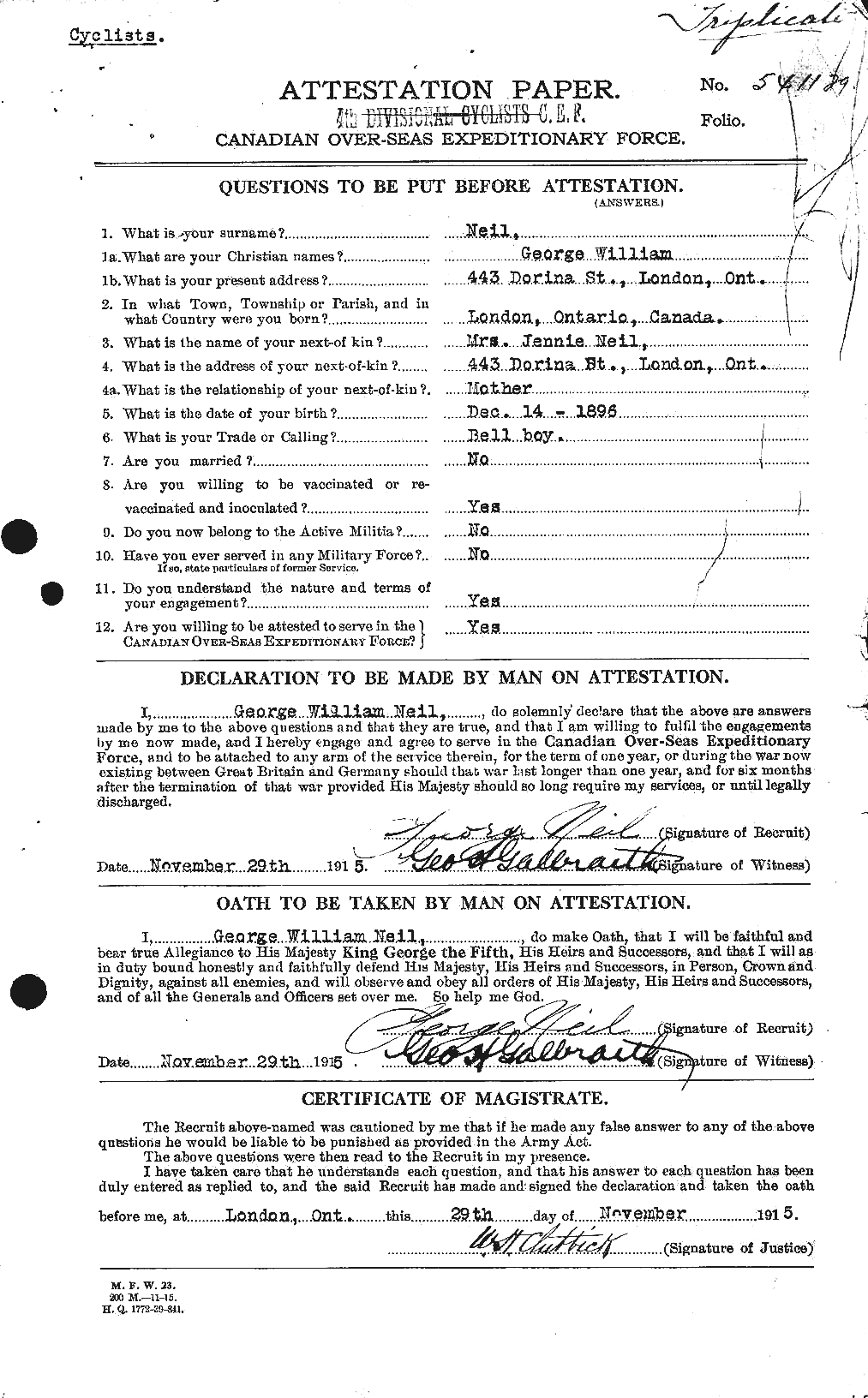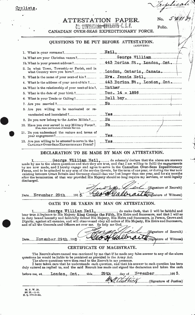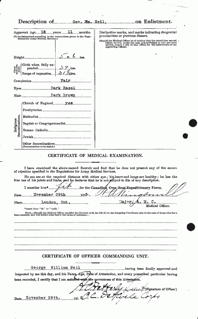 “Footnote: George William Neil was born on December 14, 1899 in London, Ontario, the son of George Neil and Jane E. Neil. He signed his Attestation Paper as a Private (541129) with the 4th Divisional Cyclists Corps, Canadian Expeditionary Force, at the 4th Divisional Cyclists Depot, on November 29, 1915 in London, Ontario, at the age of 18, naming is next-of-kin as his mother, Jane E. Neil of London, stating that he had no previous military service, that he was not married, that his religion was Church of England and that his trade was that of Bell Boy. He was admitted to hospital while in Toronto on April 12, 1916 for a case of “Tonsillitis”, a stay that would entail ten days, before being discharged on the 22nd. Private Neil embarked Halifax, Nova Scotia aboard the S.S. Baltic on May 16, 1916, arriving in England on May 29th and was taken on strength as Chiseldon. He was transferred to the 4th Reserve Battalion on June 19th. In the Fall, Private Neil was admitted to Camp Hospital at Chiseldon on September 27, 1916, with a contusion to his toe. After nine days’ treatment, he was “cured” and discharged on October 6th. One year later, Private Neil received his orders to proceed overseas for service in the French theatre on September 26, 1917, where he would be posted to the 18th Infantry Battalion. He arrived at No. 2 Canadian Infantry Base Depot at Etaples on September 27th, then posted to the Canadian Corps Reinforcement Camp on October 2nd. Private Neil would come to join the 18th Infantry Battalion, “A” Company in the field on December 12, 1917. He attended a course at the 2nd Divisional Wing, Canadian Casualty Assembly Centre on February 22, 1918 and attended the 4th Canadian Infantry Brigade Work Party on May 19, 1918. Private Neil was in action on August 8, 1918 when he received a gun shot wound (shrapnel) to his face (scalp). He was admitted to No. 10 General Hospital at Rouen on the 9th, then transferred to No. 5 Ambulance Train on the 14th, followed by his admission to No. 73 General Hospital at Trouville the same day. After five days at Trouville, he was transferred and admitted to No. 14 Convalescent Depot on the 19th, where he would recuperate for the next eighteen days, before being discharged to Base Details on September 6th. His wounding was acknowledged in an article in the London Free Press on Tuesday, August 20, 1918. He arrived at the Canadian Corps Reinforcement Camp on September 18, 1918 and was employed on Traffic Control duties with the Assistant Provost Marshal (APM), Canadian Corps, on October 2, 1918, before rejoining the 18th Infantry Battalion on the 21st. Private Neil was hospitalized once again, as he was admitted to No. 1 Canadian Casualty Clearing Station with “P.U.O.” (Pyrexia of Unknown Origin = fever) on November 25, 1918. After almost two weeks, he was taken by No. 1 Ambulance Train to No. 21 Casualty Clearing Station on December 7th, then transferred to No. 9 Canadian General Hospital at Rouen the same day, where he was diagnosed with a case of “Influenza”. Four days later, he was transferred and admitted to to No. 73 General Hospital at Trouville on the 11th, where he would be treated for the next twenty-five days, before being transferred to No. 14 Convalescent Depot on January 5, 1919 for seventeen days recuperation, before being discharged on the 22nd. He returned to England a week later, where he was posted to the Western Ontario Regimental Depot on January 30, 1919. He was placed on command to the Canadian Corps Camp at Kinmel Park, Rhyl, North Wales for return to Canada, on February 22, 1919.”Footnote: George William Neil was born on December 14, 1899 in London, Ontario, the son of George Neil and Jane E. Neil. He signed his Attestation Paper as a Private (541129) with the 4th Divisional Cyclists Corps, Canadian Expeditionary Force, at the 4th Divisional Cyclists Depot, on November 29, 1915 in London, Ontario, at the age of 18, naming is next-of-kin as his mother, Jane E. Neil of London, stating that he had no previous military service, that he was not married, that his religion was Church of England and that his trade was that of Bell Boy. He was admitted to hospital while in Toronto on April 12, 1916 for a case of “Tonsillitis”, a stay that would entail ten days, before being discharged on the 22nd. Private Neil embarked Halifax, Nova Scotia aboard the S.S. Baltic on May 16, 1916, arriving in England on May 29th and was taken on strength as Chiseldon. He was transferred to the 4th Reserve Battalion on June 19th. In the Fall, Private Neil was admitted to Camp Hospital at Chiseldon on September 27, 1916, with a contusion to his toe. After nine days’ treatment, he was “cured” and discharged on October 6th. One year later, Private Neil received his orders to proceed overseas for service in the French theatre on September 26, 1917, where he would be posted to the 18th Infantry Battalion. He arrived at No. 2 Canadian Infantry Base Depot at Etaples on September 27th, then posted to the Canadian Corps Reinforcement Camp on October 2nd. Private Neil would come to join the 18th Infantry Battalion, “A” Company in the field on December 12, 1917. He attended a course at the 2nd Divisional Wing, Canadian Casualty Assembly Centre on February 22, 1918 and attended the 4th Canadian Infantry Brigade Work Party on May 19, 1918. Private Neil was in action on August 8, 1918 when he received a gun shot wound (shrapnel) to his face (scalp). He was admitted to No. 10 General Hospital at Rouen on the 9th, then transferred to No. 5 Ambulance Train on the 14th, followed by his admission to No. 73 General Hospital at Trouville the same day. After five days at Trouville, he was transferred and admitted to No. 14 Convalescent Depot on the 19th, where he would recuperate for the next eighteen days, before being discharged to Base Details on September 6th. His wounding was acknowledged in an article in the London Free Press on Tuesday