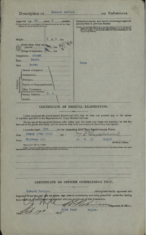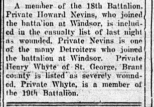 A member of the 18th Battalion, Private Howard Nevins, who joined the battalion at Windsor, is included in the casualty list of last night as wounded. Private Nevins is one of the many Detroiters who joined the battalion at Windsor. Private Henry Whyte of St. George, Brant County, is listed as severely wounded. Private Whyte is a member of the 19th Battalion.