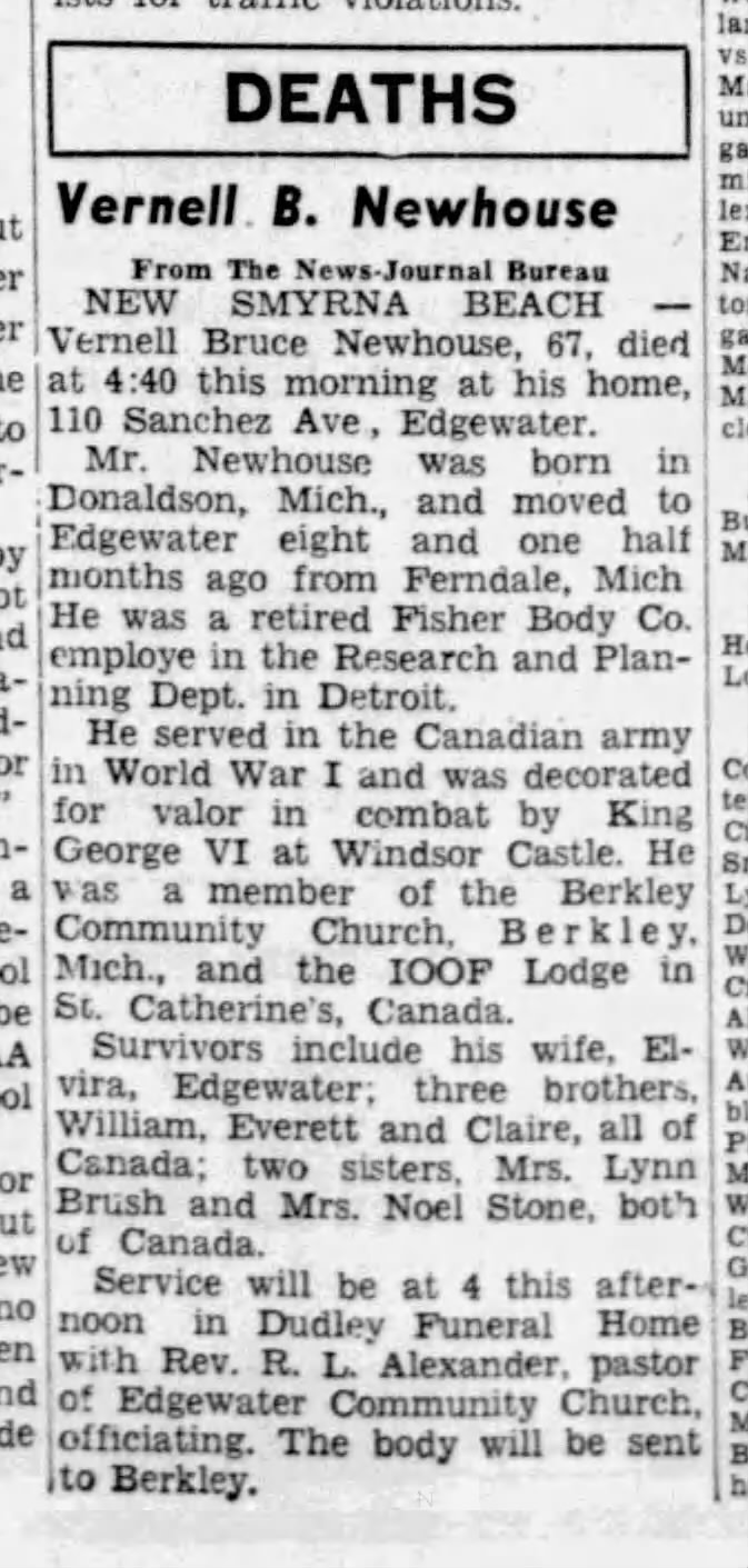 NEW SMYRNA BEACH — Vernell Bruce Newhouse, 67, died at 4:40 this morning at his home, 110 Sanchez Ave, Edgewater.