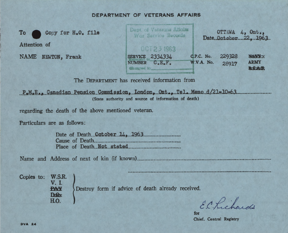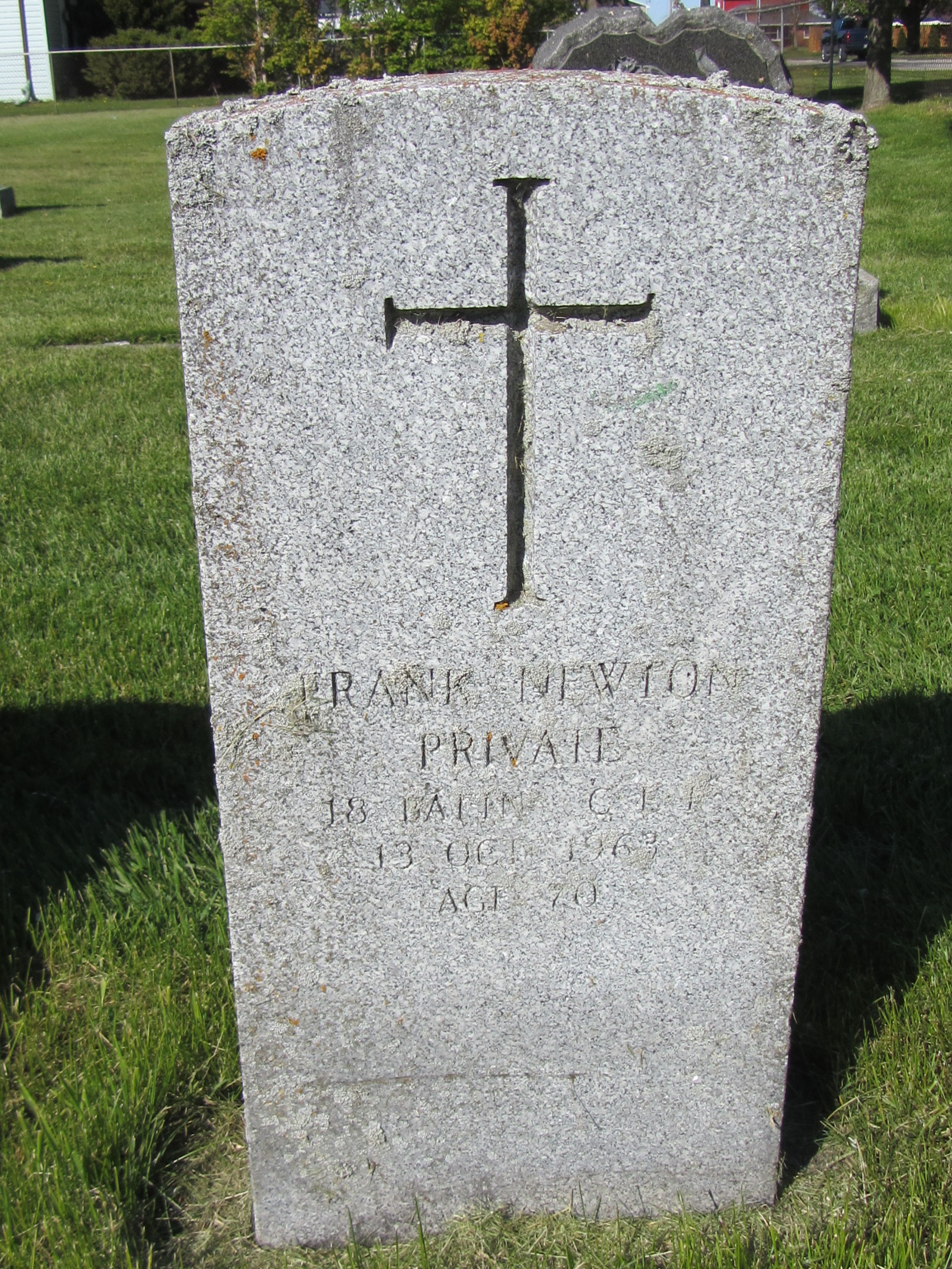 Frank Newton enlisted in May 1917 with the 18th Battalion Canadian Expeditionary Forces. Born in England, his mother was Mrs. Annie Newton and they lived in London, Ontario. Following the war they lived in Thamesford where he was a shoemaker. He is buried in St. John’s Anglican Cemetery in Thamesford, Ontario.