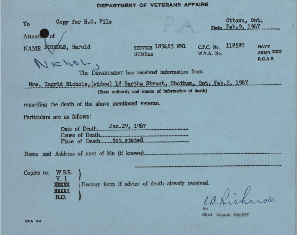 Family Search: Private Harold Leroy Nichols was born on 9 May 1894, in Elsacraig-Comber, Essex, Ontario, Canada as the son of Father Nichols. He lived in London, Ontario, Canada in 1919. He registered for military service in 1915. In 1961, at the age of 67, his occupation is listed as spencer stone stores in Chatham, Kent, Ontario, Canada. He died on 29 January 1967, in Chatham, Kent, Ontario, Canada, at the age of 72, and was buried in Maple Leaf Cemetery, Chatham, Chatham-Kent, Ontario, Canada.