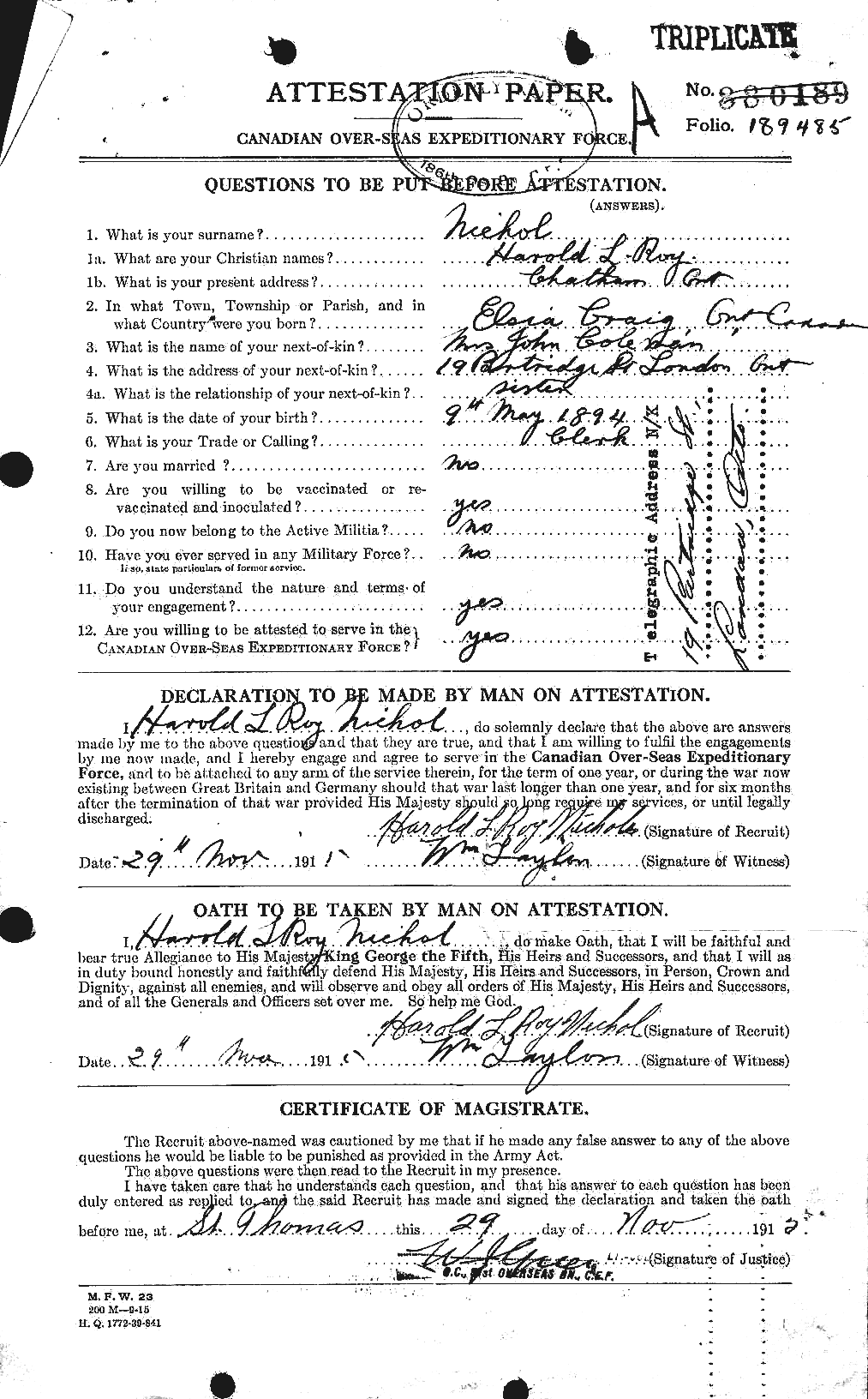 Family Search: Private Harold Leroy Nichols was born on 9 May 1894, in Elsacraig-Comber, Essex, Ontario, Canada as the son of Father Nichols. He lived in London, Ontario, Canada in 1919. He registered for military service in 1915. In 1961, at the age of 67, his occupation is listed as spencer stone stores in Chatham, Kent, Ontario, Canada. He died on 29 January 1967, in Chatham, Kent, Ontario, Canada, at the age of 72, and was buried in Maple Leaf Cemetery, Chatham, Chatham-Kent, Ontario, Canada.