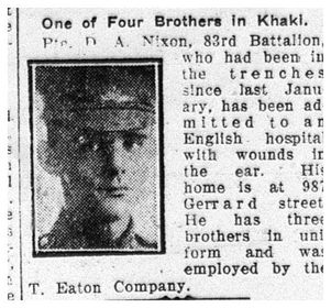 Nixon, David A.: Service no. 171179 Digitized Service Record Source: Per news clipping post by Helen Woytowich at 18th Battalion Facebook Page (not group). Find-A-Grave Nixon, David A.: Service no. 171179. Source: Toronto Telegram. September 1916. Via Helen Woytowich. Nixon, David A.: Service no. 171179. Source: Toronto Telegram. September 1916. Via Helen Woytowich. Share this: Click to email a link to a friend (Opens in new window) Email Click to share on Facebook (Opens in new window) Facebook Click to share on X (Opens in new window) X Click to share on Reddit (Opens in new window) Reddit Click to share on LinkedIn (Opens in new window) LinkedIn Click to print (Opens in new window) Print Click to share on Tumblr (Opens in new window) Tumblr Click to share on Pocket (Opens in new window) Pocket Click to share on Pinterest (Opens in new window) Pinterest Click to share on Telegram (Opens in new window) Telegram Click to share on WhatsApp (Opens in new window) WhatsApp Like Loading...