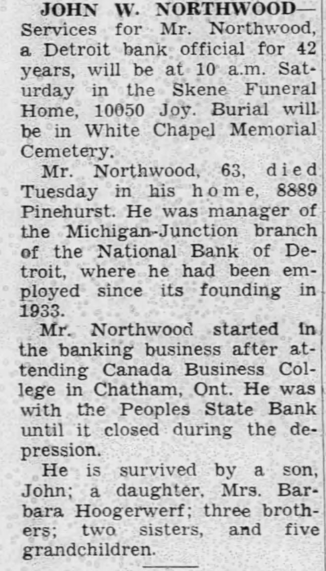 Family Search: When Private John Wesley Northwood was born on 20 April 1898, in Lambton, Ontario, Canada, his father, Jabez Northwood, was 32 and his mother, Josephine Cook, was 31. He married Pearl Lizetta Terry on 6 February 1924, in Detroit, Wayne, Michigan, United States. They were the parents of at least 1 son and 1 daughter. He lived in Thedford, Lambton, Ontario, Canada in 1916. He registered for military service in 1916. In 1916, at the age of 18, his occupation is listed as student in Thedford, Lambton, Ontario, Canada. He died on 27 March 1962, in Detroit, Wayne, Michigan, United States, at the age of 63.