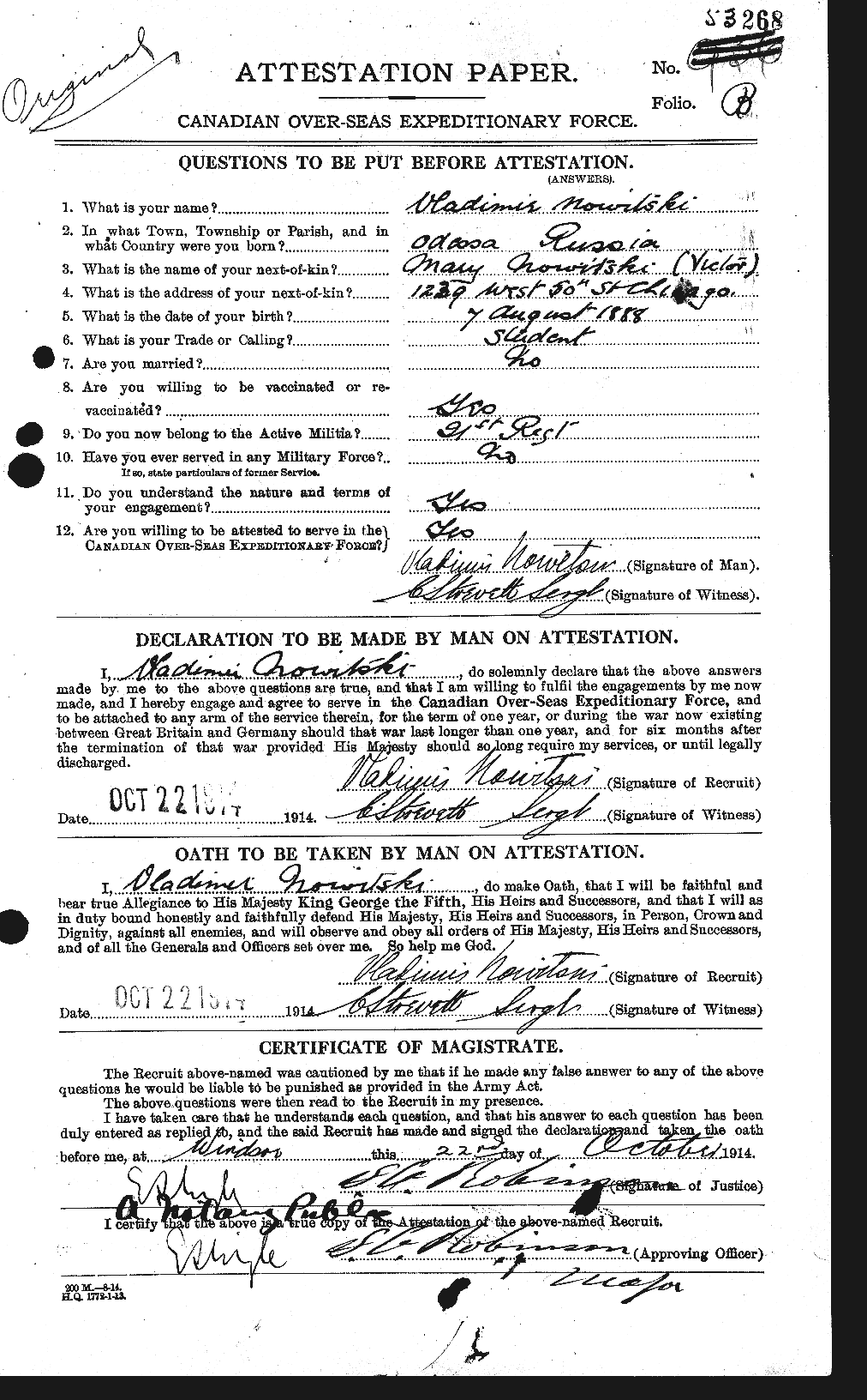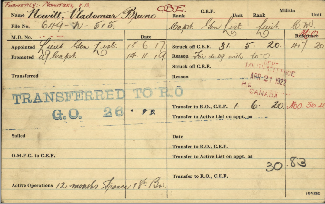 In 1914, Vladimir went to Canada to enlist in the Canadian Army (18th Canadian Infantry Battalion), using the last name of Nowitski. He took part in many battles in France. He was invalided from France and was hospitalized from September 1916 to February 1917. Vladimir was then employed at the War Office compiling English-Russian and Russian-English Military Dictionaries (M.I.2.d. and M.I.7.c.). In June 1917, he was granted a commission in the Canadian Forces and was employed by G.H.Q. Canadians London in connection with Russians serving in the Canadian forces.