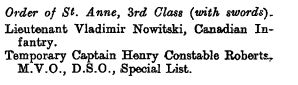 In January 1918, he was awarded the (Russian) Order of St. Anne, 3rd Class (with swords). In August 1918, he was seconded to the British War Office. He was employed as Allied District Military Control Officer in North Russia (Archangel) from October 1918 to September 1919. Then he was employed as the British Liaison Officer in North Russia. At that time, he was the only British official of any description there. In February 1920, as the Bolsheviks were advancing on Archangel, he escaped, walking (or with skis) 850 miles to Finland. He then arrived in the United Kingdom on March 19, 1920. Upon his return, he was employed by MI5. He also became a British citizen and changed his name to Valdemar Bruno Nowitt.