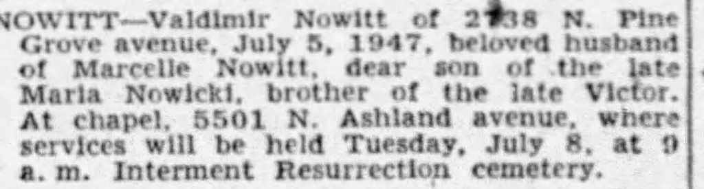 Family Search: Captain Valdemar Bruno Nowitt was born on 7 August 1888, in Odessa, Kherson, Russian Empire as the son of Maria Nowicki. He immigrated to Ellis Island, New York City, New York, United States in 1923 and lived in Chicago, Cook, Illinois, United States in 1947. He died on 5 July 1947, in Justice, Cook, Illinois, United States, at the age of 58, and was buried in Resurrection Catholic Cemetery, Justice, Cook, Illinois, United States