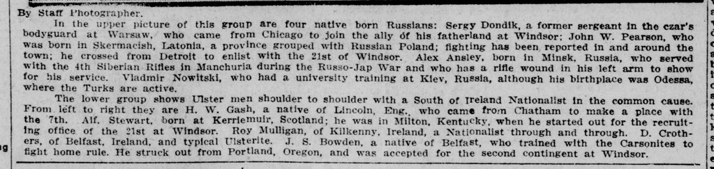 My Great-Uncle (Vladimir Nowitski or Novitzky)) emigrated to the US from Russia in 1909. He joined the Canadian Army (CEF) in 1914. After serving in France, he was sent to London to work for the War Office. He created a Military Russian-English dictionary for them. He also was attached to the Russian Government Committee as — “Attached Russian Military Attache”. He was employed as an interpreter at the end of 1918 with the Archangel Force and was left there, after the final withdrawal, as British Liaison Officer, rank of temp. Captain. I have a Western Union Telegram sent from Archangel, Christmas, 1919. The Bolsheviks marched into Archangel on February 20, 1920. He escaped around March 3 and via skis and foot, got to Finland. He arrived back in England (Hull) from Finland on March 20. As of April 1, 1920, he was employed by MI5 for about a year or so. Probably de-briefed?? (Most of these facts are direct from the National Archives at Kew).