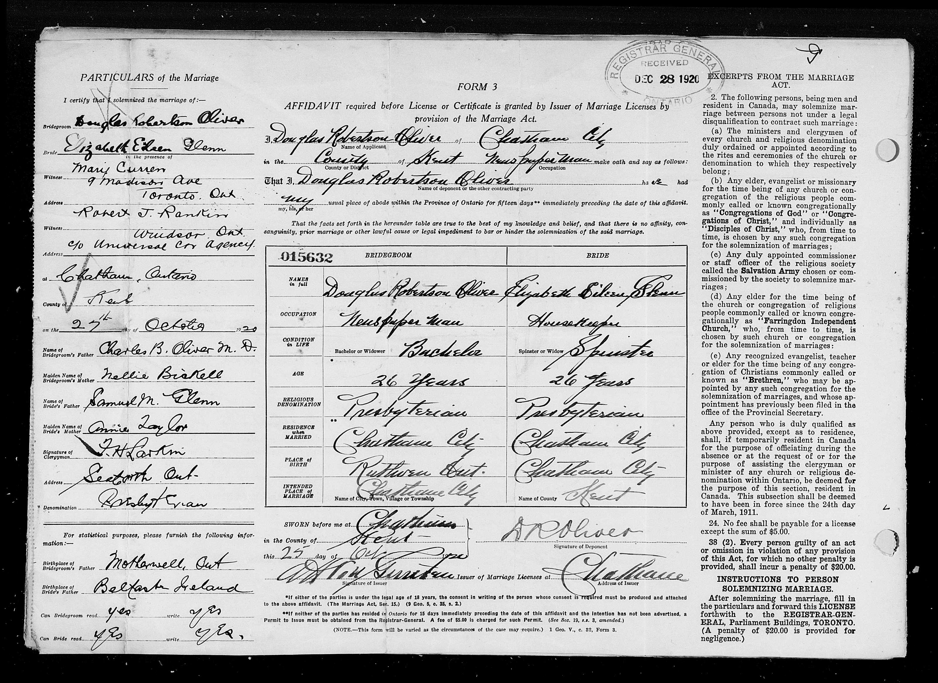 Family Search: When Captain Douglas Robertson Oliver was born on 23 January 1894, in Ruthven, Kingsville, Essex, Ontario, Canada, his father, Charles B. Oliver, was 28 and his mother, Helen N. Bickell, was 27. He had at least 1 daughter with Eileen Glenn. He registered for military service in 1929. In 1915, at the age of 21, his occupation is listed as 212 wellington street, west in Chatham, Kent, Ontario, Canada. He died on 14 January 1973, in Toronto, Ontario, Canada, at the age of 78, and was buried in Mount Pleasant Cemetery, Toronto, Ontario, Canada.