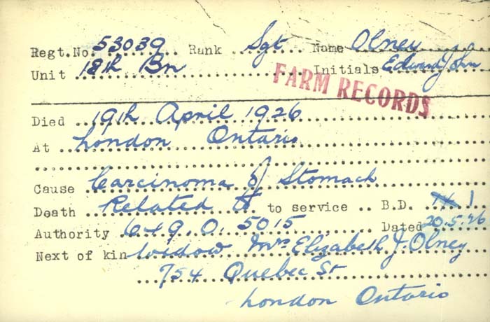 Olney, Charles John: Service no. 53039 Digitized Service Record Source: Per photograph of headstone by the London Robinsons at the 18th Battalion Facebook Group. Find-A-Grave Source: London Robinsons at the 18th Battalion Facebook Group. Share this: Click to email a link to a friend (Opens in new window) Email Click to share on Facebook (Opens in new window) Facebook Click to share on X (Opens in new window) X Click to share on Reddit (Opens in new window) Reddit Click to share on LinkedIn (Opens in new window) LinkedIn Click to print (Opens in new window) Print Click to share on Tumblr (Opens in new window) Tumblr Click to share on Pocket (Opens in new window) Pocket Click to share on Pinterest (Opens in new window) Pinterest Click to share on Telegram (Opens in new window) Telegram Click to share on WhatsApp (Opens in new window) WhatsApp Like Loading...