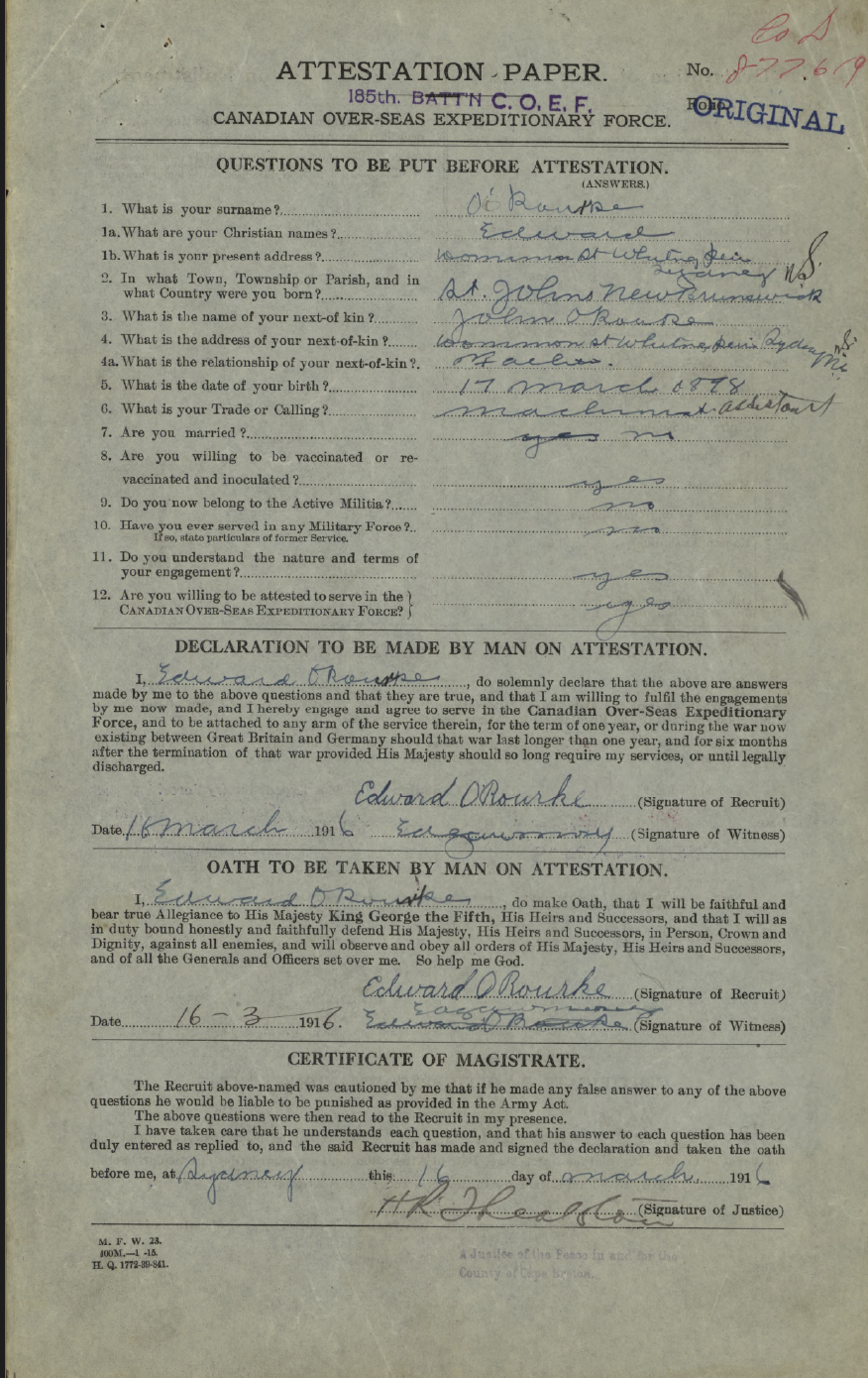 Family Search: When Private Edward Thomas O’Rourke was born on 8 March 1898, in St. John, New Brunswick, Canada, his father, John James Rourke, was 26 and his mother, Rosemund McDade, was 22. He married Ada Isabelle Rogers on 18 January 1941, in Sydney, Cape Breton, Nova Scotia, Canada. He lived in Sydney, Cape Breton, Nova Scotia, Canada in 1931. In 1931, at the age of 33, his occupation is listed as sailor in Sydney, Cape Breton, Nova Scotia, Canada.