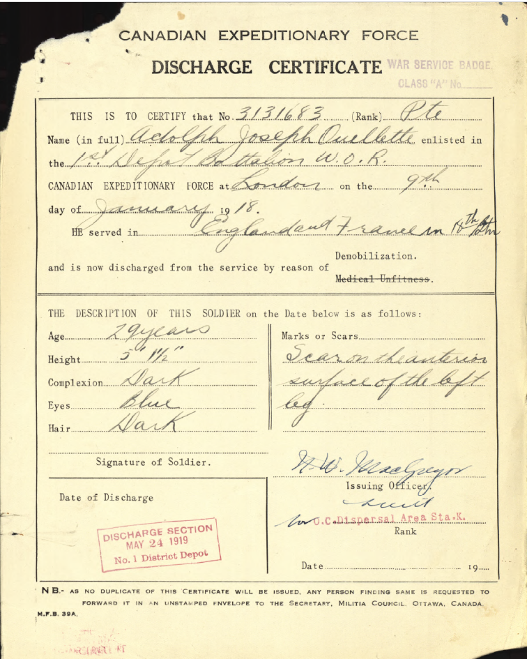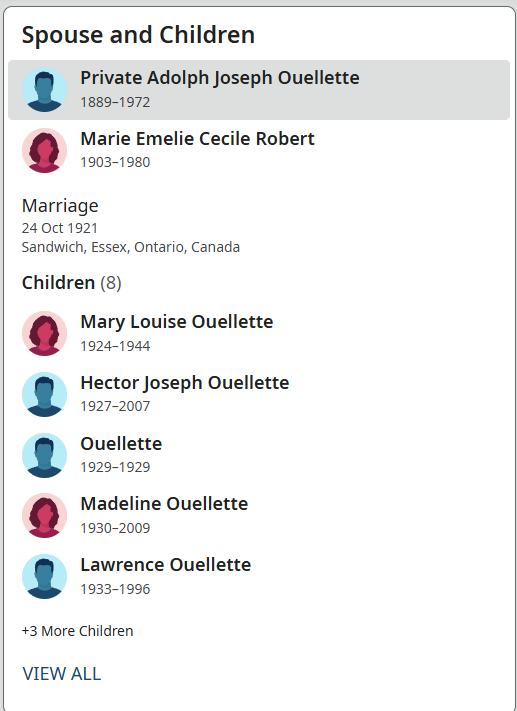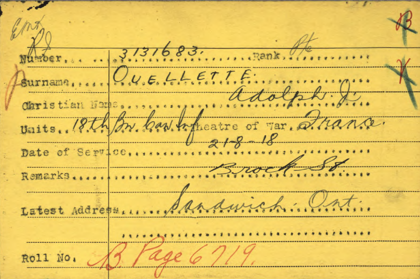 Family Search: When Private Adolph Joseph Ouellette was born on 24 October 1889, in Sandwich, Essex, Ontario, Canada, his father, Jacob Ouellette, was 42 and his mother, Josephine Julie Gerard, was 35. He married Marie Emelie Cecile Robert on 24 October 1921, in Sandwich, Essex, Ontario, Canada. They were the parents of at least 3 sons and 5 daughters. He lived in Ontario, Canada in 1889 and Essex, Ontario, Canada for about 10 years. He registered for military service in 1918. In 1918, at the age of 29, his occupation is listed as teamster in Sandwich, Essex, Ontario, Canada. He died on 30 March 1972, in Windsor, Essex, Ontario, Canada, at the age of 82, and was buried in Saint John’s Anglican Church Cemetery, Windsor, Essex, Ontario, Canada.
