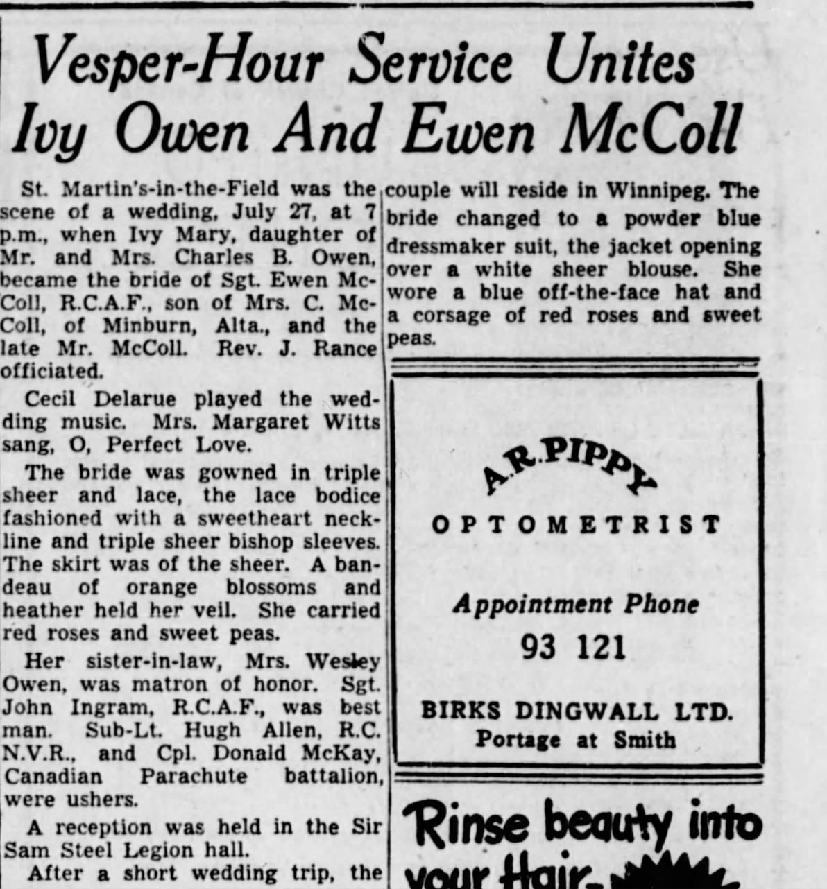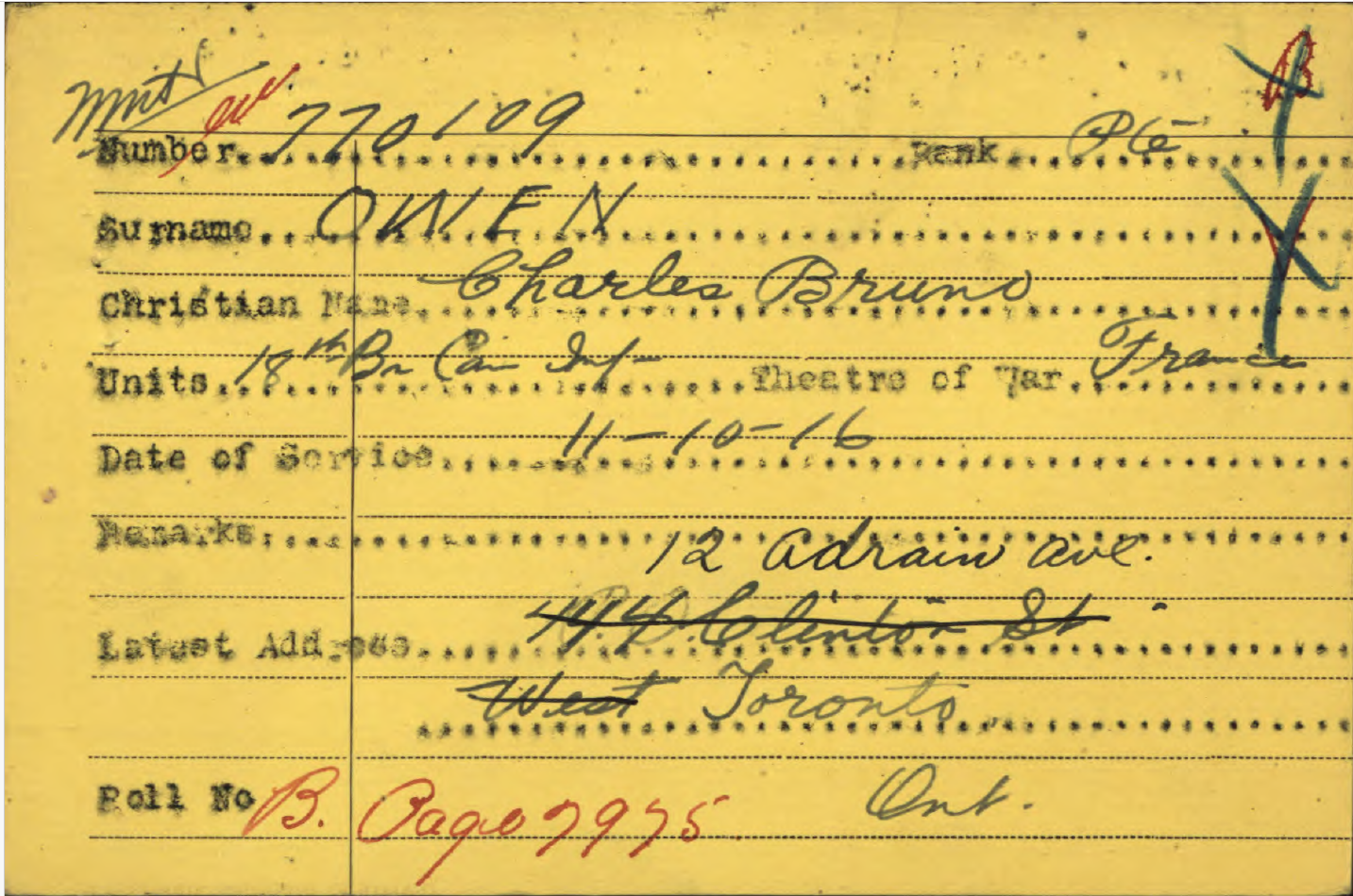 Family Search: When Private Charles Bruno Owen was born on 17 February 1890, in Willesden, London, England, United Kingdom, his father, Charles Wesley Owen, was 31 and his mother, Mary Owen, was 27. He married Emily Alice Miriam Rainer on 9 August 1920, in Toronto, Ontario, Canada. They were the parents of at least 1 son and 1 daughter. He lived in Willesden, Middlesex, England, United Kingdom for about 10 years and Winnipeg, Winnipeg, Manitoba, Canada in 1931. He died on 4 February 1974, in Winnipeg, Manitoba, Canada, at the age of 83, and was buried in St. John’s Anglican Cathedral Cemetery, Winnipeg, Winnipeg, Manitoba, Canada.