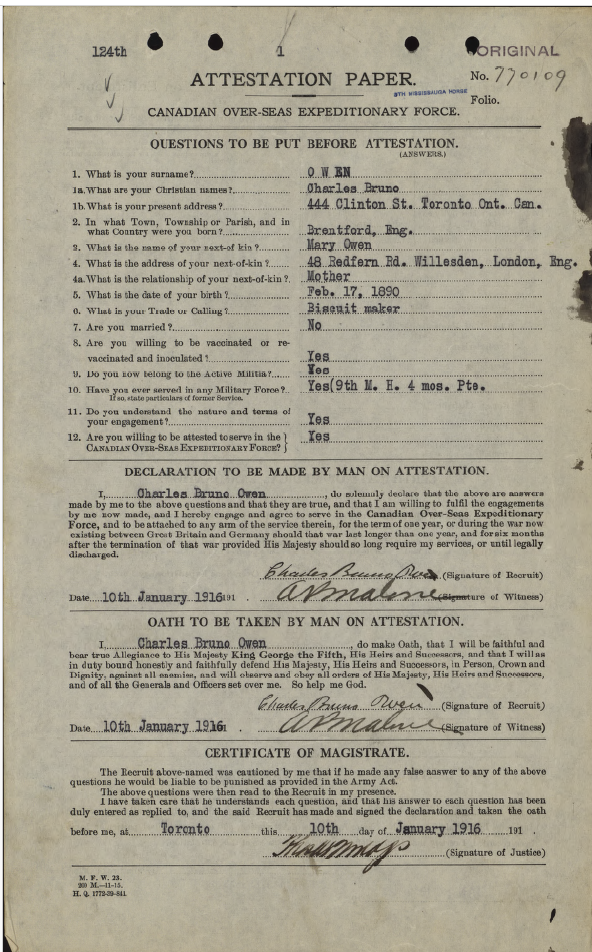 This man enlisted with the 124th Battalion on 10 January 1916 at Toronto, Ontario.