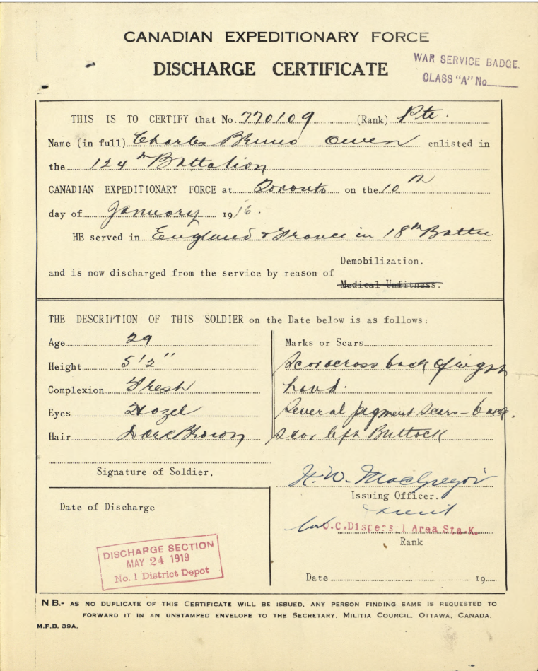 He served the rest of the war with the 18th and was discharged due to demobilization on 24 May 1919 at London, Ontario.