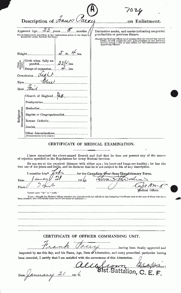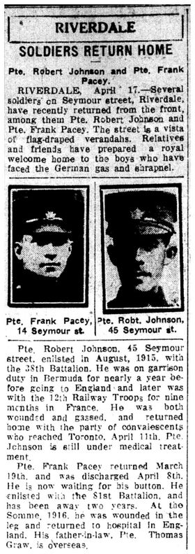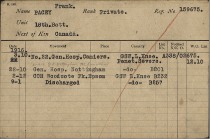 Pacey, Frank: Service no. 159675 Digitized Service Record Source: Per news clipping post by David Archer at 18th Battalion Facebook Page (not group). Find-A-Grave Pacey, Frank: Service no. 159675. Source: Toronto Telegram. October 1916. Via David Archer. Source: Toronto Telegram. April 1918. Via David Archer. Share this: Click to email a link to a friend (Opens in new window) Email Click to share on Facebook (Opens in new window) Facebook Click to share on X (Opens in new window) X Click to share on Reddit (Opens in new window) Reddit Click to share on LinkedIn (Opens in new window) LinkedIn Click to print (Opens in new window) Print Click to share on Tumblr (Opens in new window) Tumblr Click to share on Pocket (Opens in new window) Pocket Click to share on Pinterest (Opens in new window) Pinterest Click to share on Telegram (Opens in new window) Telegram Click to share on WhatsApp (Opens in new window) WhatsApp Like Loading...