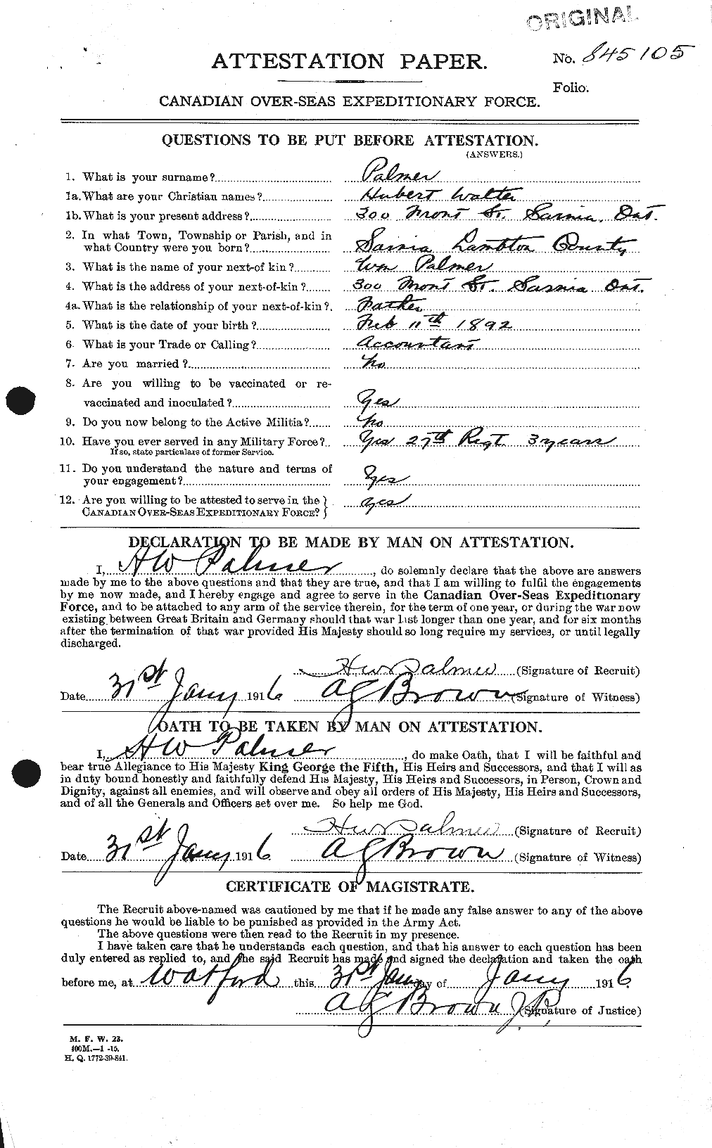 Family Search: When Private Herbert Walter Palmer was born on 11 February 1892, in Sarnia, Lambton, Ontario, Canada, his father, William Palmer, was 29 and his mother, Hannah Margaret Underwood, was 24. He married Mary Elizabeth Ferguson on 15 August 1936, in Woodstock, Oxford, Ontario, Canada. He lived in Lambton, Ontario, Canada for about 10 years. He registered for military service in 1916. In 1936, at the age of 44, his occupation is listed as tax collector in Sarnia, Lambton, Ontario, Canada. He died on 2 April 1982, at the age of 90, and was buried in Lakeview Cemetery, Sarnia, Lambton, Ontario, Canada.