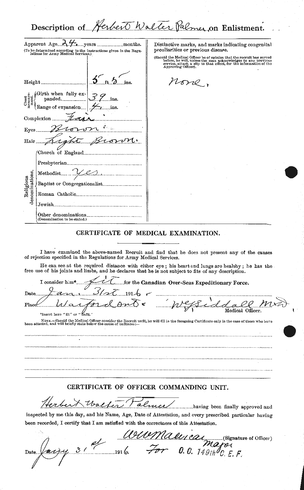 This man enlisted with the 149th Battalion on 31 January 1916 at Watford, Ontario.
