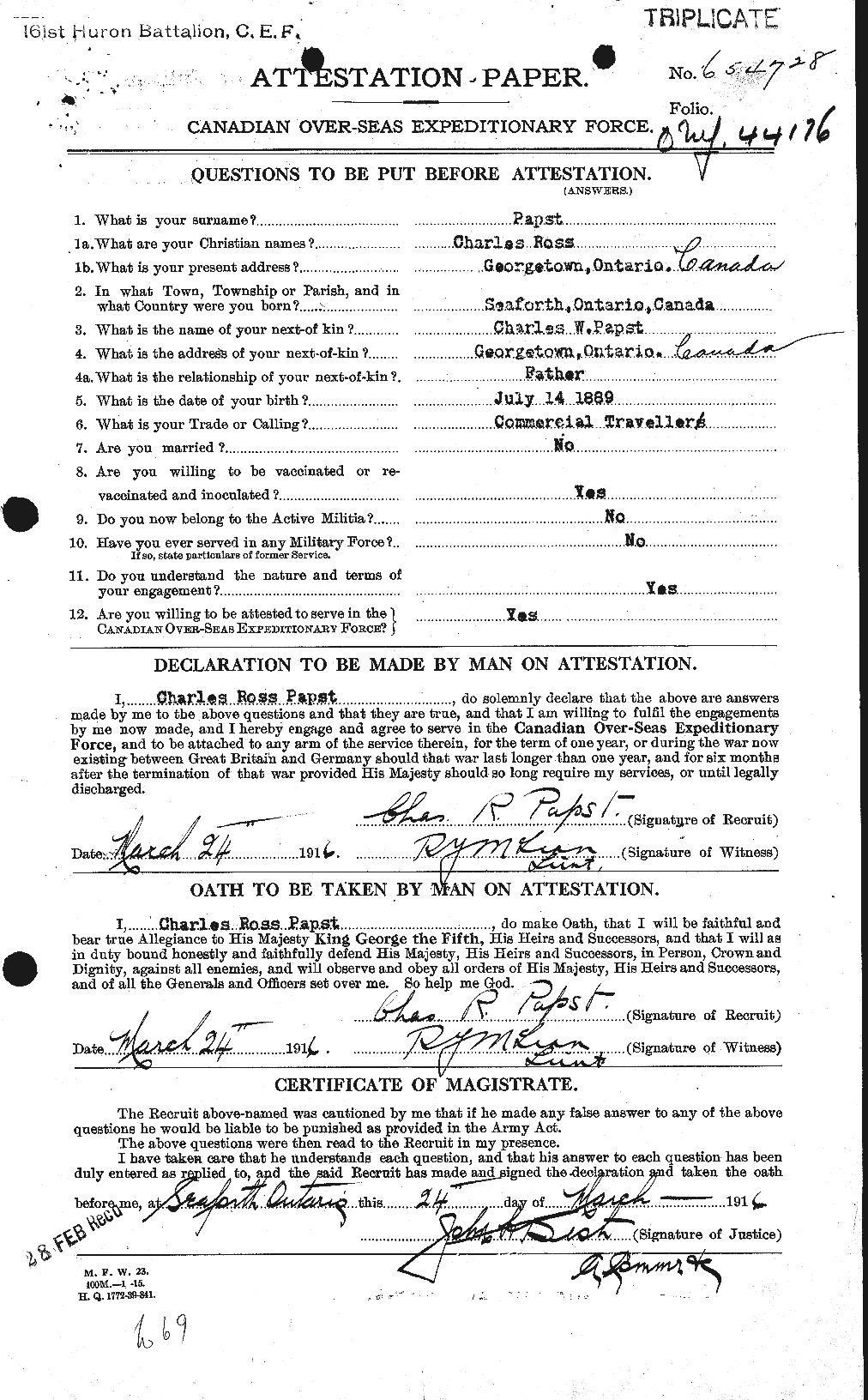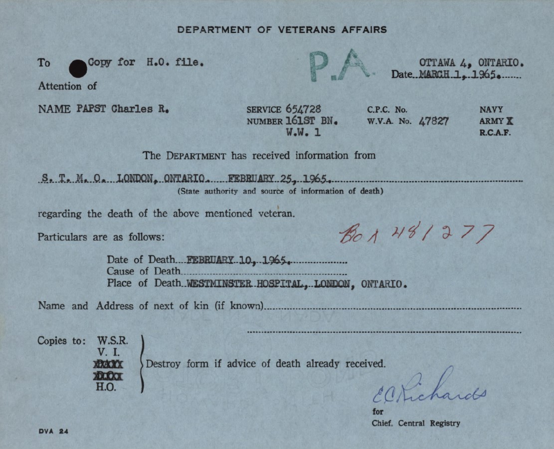 Papst, Charles Ross: Service no. 654728 Digitized Service Record Source: Per photograph of headstone by the London Robinsons at the 18th Battalion Facebook Group. Find-A-Grave Source: Per photograph of headstone by the London Robinsons at the 18th Battalion Facebook Group. Share this: Click to email a link to a friend (Opens in new window) Email Click to share on Facebook (Opens in new window) Facebook Click to share on X (Opens in new window) X Click to share on Reddit (Opens in new window) Reddit Click to share on LinkedIn (Opens in new window) LinkedIn Click to print (Opens in new window) Print Click to share on Tumblr (Opens in new window) Tumblr Click to share on Pocket (Opens in new window) Pocket Click to share on Pinterest (Opens in new window) Pinterest Click to share on Telegram (Opens in new window) Telegram Click to share on WhatsApp (Opens in new window) WhatsApp Like Loading...
