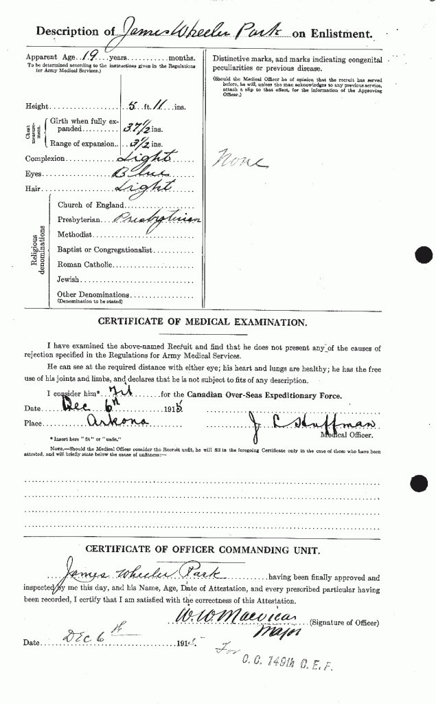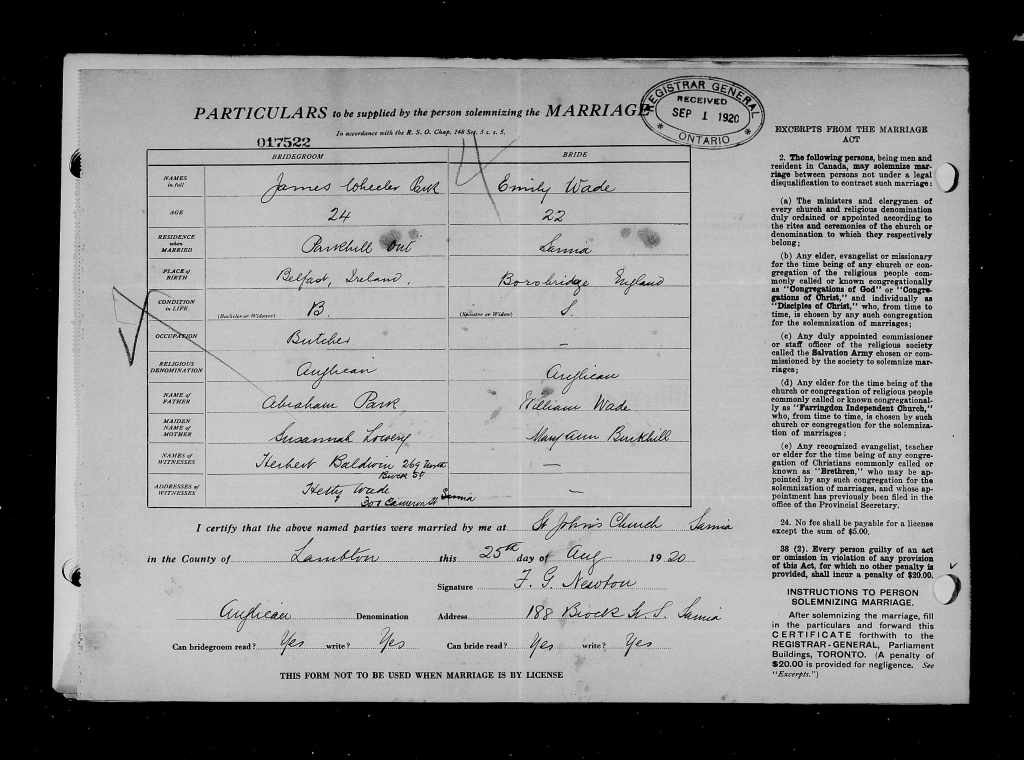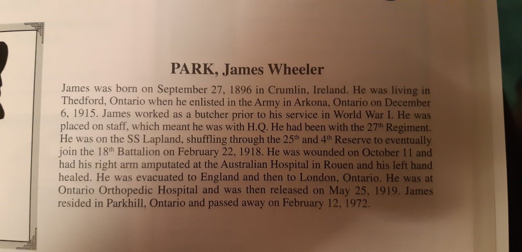Family Search: When Private James Wheeler Park was born on 27 September 1896, in Crumlin, County Dublin, Ireland, his father, Abram Park, was 25 and his mother, Susanna Lowry, was 24. He married Emily Wade on 25 August 1920, in Sarnia, Lambton, Ontario, Canada. They were the parents of at least 3 sons and 2 daughters. He immigrated to Canada in 1914 and lived in Thedford, Lambton, Ontario, Canada in 1915. He registered for military service in 1915. In 1915, at the age of 19, his occupation is listed as butcher in Thedford, Lambton, Ontario, Canada. He died on 12 February 1972, at the age of 75, and was buried in Christ Church Anglican Cemetery, Glanworth, London, Ontario, Canada.
