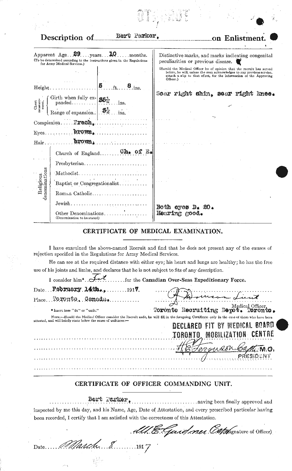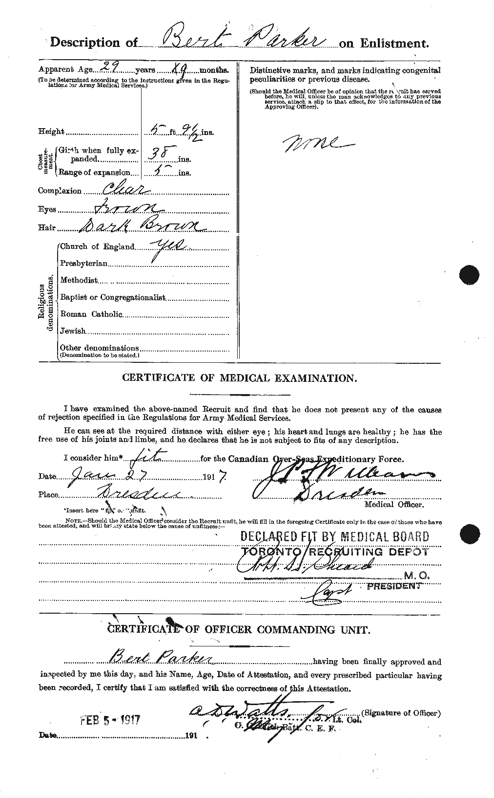 Private Bert Parker trained until April 1915, going overseas then under command of Colonel Wigel of Windsor. After some training in England he was returned to Canada as medically unfit for further service and discharged Feb 21st 1916.
