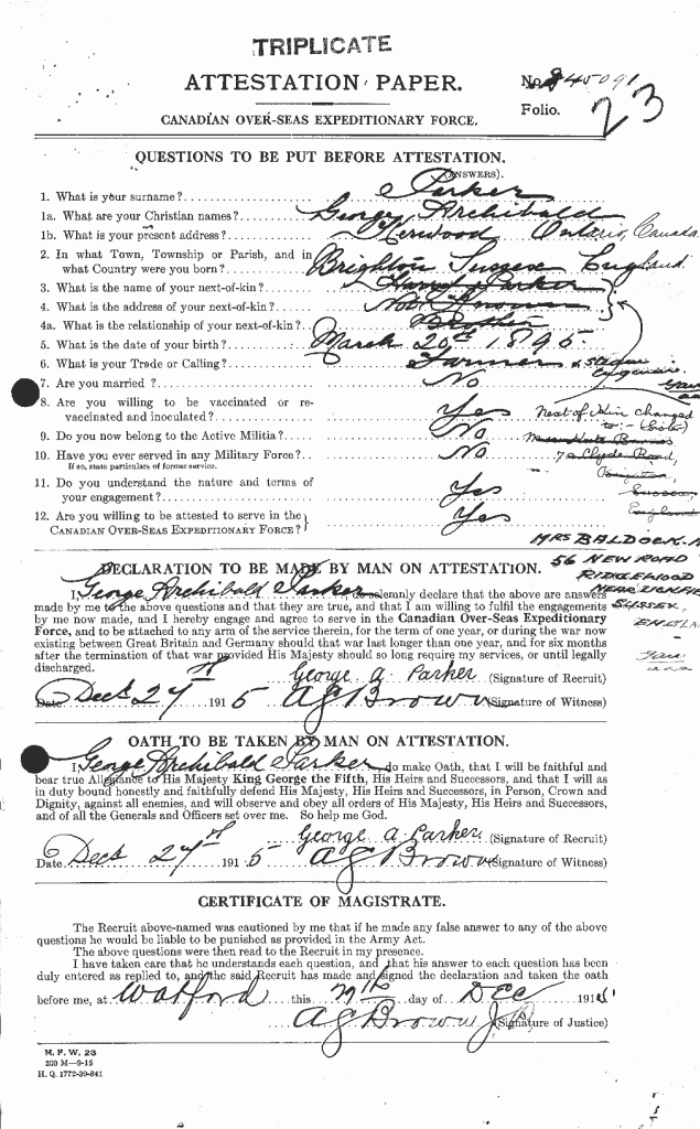 Family Search: Private George Archibald Parker was born on 20 March 1895, in Brighton, Sussex, England, United Kingdom. He married Isabel Sarah Bates on 1 August 1921, in Kitchener, Waterloo, Ontario, Canada. They were the parents of at least 1 son and 1 daughter. He registered for military service in 1915. In 1958, his occupation is listed as kitchener port authority in Kitchener, Waterloo, Ontario, Canada. He died on 25 September 1961, in Kitchener, Waterloo, Ontario, Canada, at the age of 66, and was buried in Mount Hope Cemetery, Kitchener, Waterloo, Ontario, Canada.