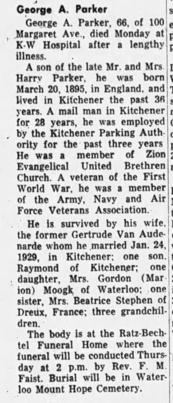 A son of the late Mr. and Mrs. Harry Parker, he was born March 20, 1895, in England, and lived in Kitchener the past 36 years. A mail man in Kitchener for 28 years, he was employed by the Kitchener Parking Authority for the past three years. He was a member of Zion Evangelical United Brethren Church. A veteran of the First World War, he was a member of the Army, Navy and Air Force Veterans Association.