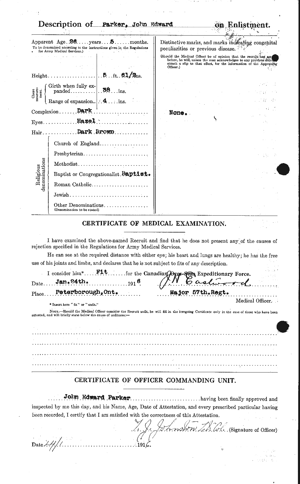 | February 5, 1919 | Medical Exam for soldier with no disability. | Lance-Corporal Parker loses 2” of height and gains 20 pounds from his medical exam on December 29, 1918. |