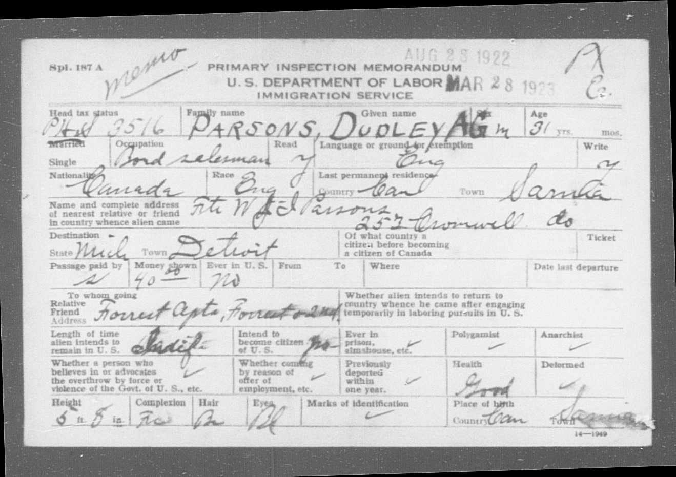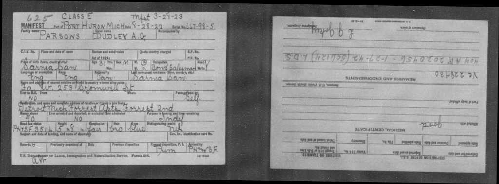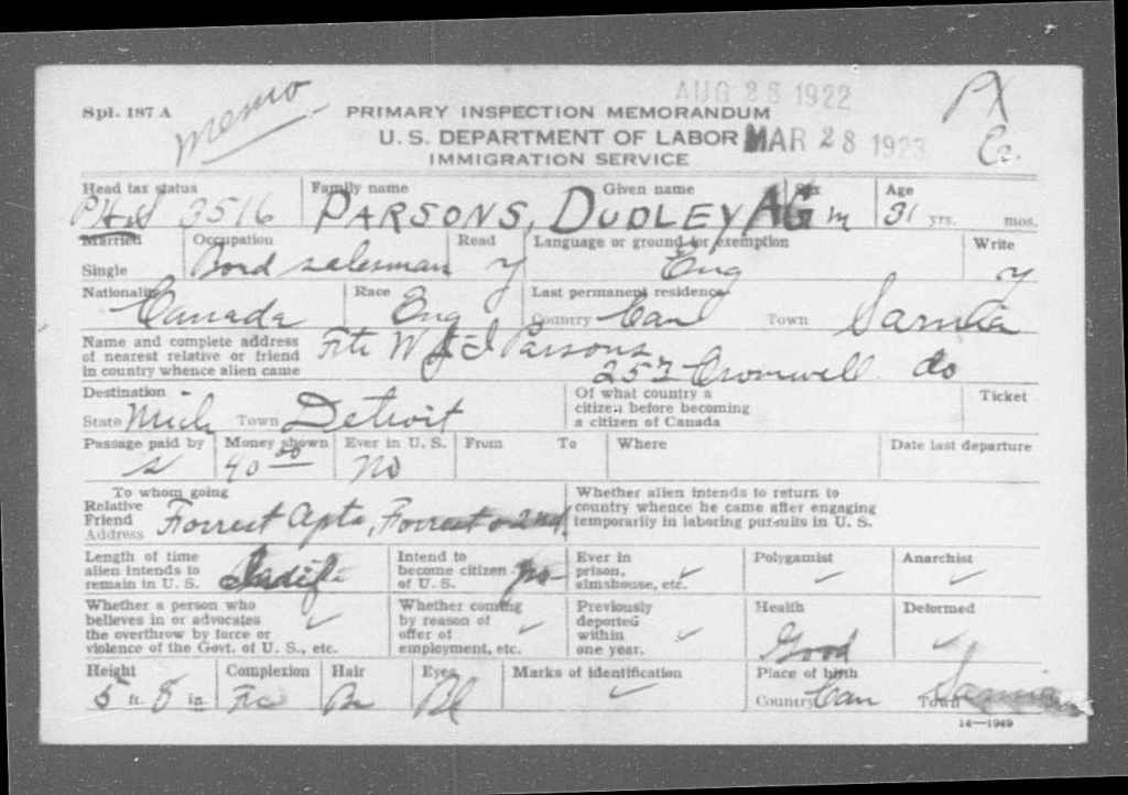 Family Search: When Dudley Anson Gordon Parsons was born on 29 July 1891, in Sarnia, Lambton, Ontario, Canada, his father, William Parsons, was 27 and his mother, Annie Rebecca Ball, was 27. He lived in Lambton, Ontario, Canada for about 10 years. He registered for military service in 1915. In 1915, at the age of 24, his occupation is listed as clerk. He died on 7 September 1953, in Chicago, Cook, Illinois, United States, at the age of 62, and was buried in Calvary Cemetery, St. Louis, St. Louis, Missouri, United States.