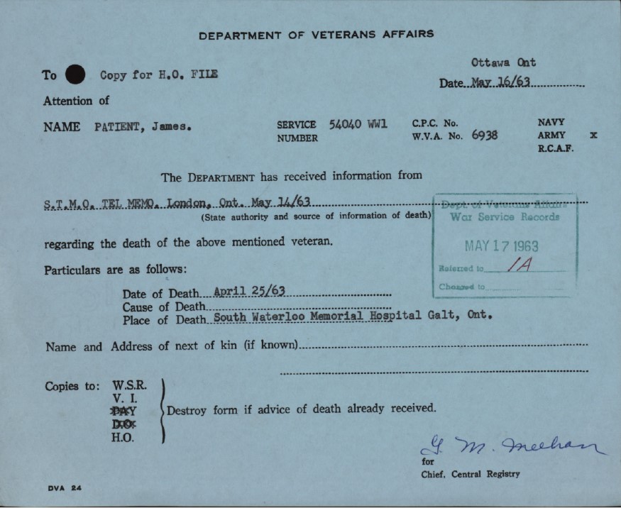 The Patient family live at 12 Close Avenue, Galt. The family was comprised of James and Charlotted Patient and their 11 children. The son, James George enlisted with the 18th Battalion at Galt on 23 November 1914, and this was followed by his father on 2 November. They served together with the 18th Battalion until the father was released from service on 2 March 1916 while the Battalion was serving near Ypres, Belgium.